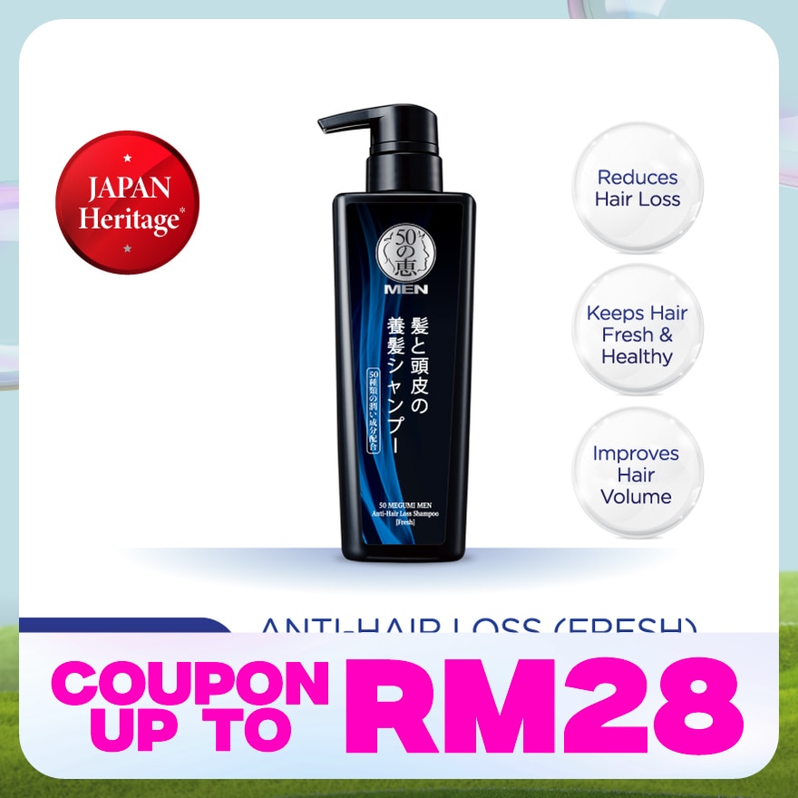 After rinsing, pump an appropriate amount onto hands, massage scalp with fingertips, and then rinse thoroughly. Use together with 50 MEGUMI MEN Anti-Hair Loss Treatment Essence for best results. Massage scalp with fingertips, and then rinse thoroughly. Use together with 50 MEGUMI MEN Anti-Hair Loss Treatment Essence for best results.