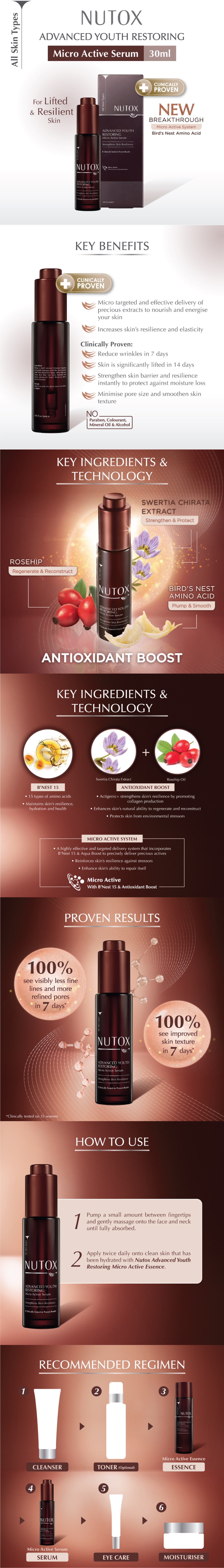 Turn back the effects of time with a boost of Nutox Advanced Youth Restoring Micro Active Serum. With superior Micro Active System, this fast-acting serum is formulated to target your skin directly and effectively delivering precious extracts to nourish and energise your skin, while increasing skin resilience and elasticity. Look visibly younger with firmer skin that is dewy and radiant.