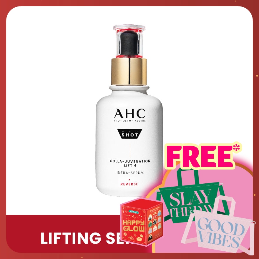 AHC PRO SHOT COLLA- JUVENATION LIFT 4 INTRA-SERUM 40ML uses 4D SKIN RENEWAL TECHNOLOGY inspired by professional reversive treatments to re-surface + re-texturize skin, reverse deep wrinkles, firm and lift sagging skin. It contains: 4 COLLAGEN + 4 PEPTIDES CPX 1% to tighten + firm skin, PRO-RETI 4 HPR CPX 1% to re-surface + re-texturize skin, FRENCH RED ALGAE to lift sagging skin, ADENOSINE to reduce deep wrinkles, ALLANTOIN to help skin turnover.