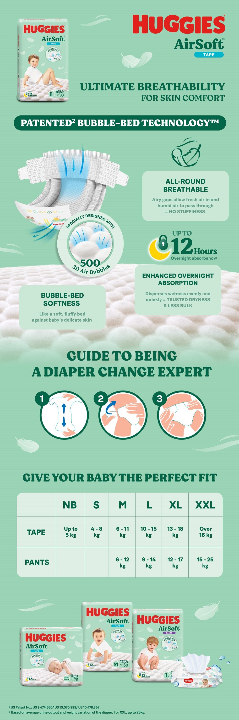 HUGGIES AirSoft Tape Diapers are specially designed with Breathable BUBBLE-BED for Ultimate Airy Comfort your baby's delicate skin - while providing up to 12 hours Overnight Absorbency. ed with Breathable BUBBLE-BED to protect baby's delicate skin.