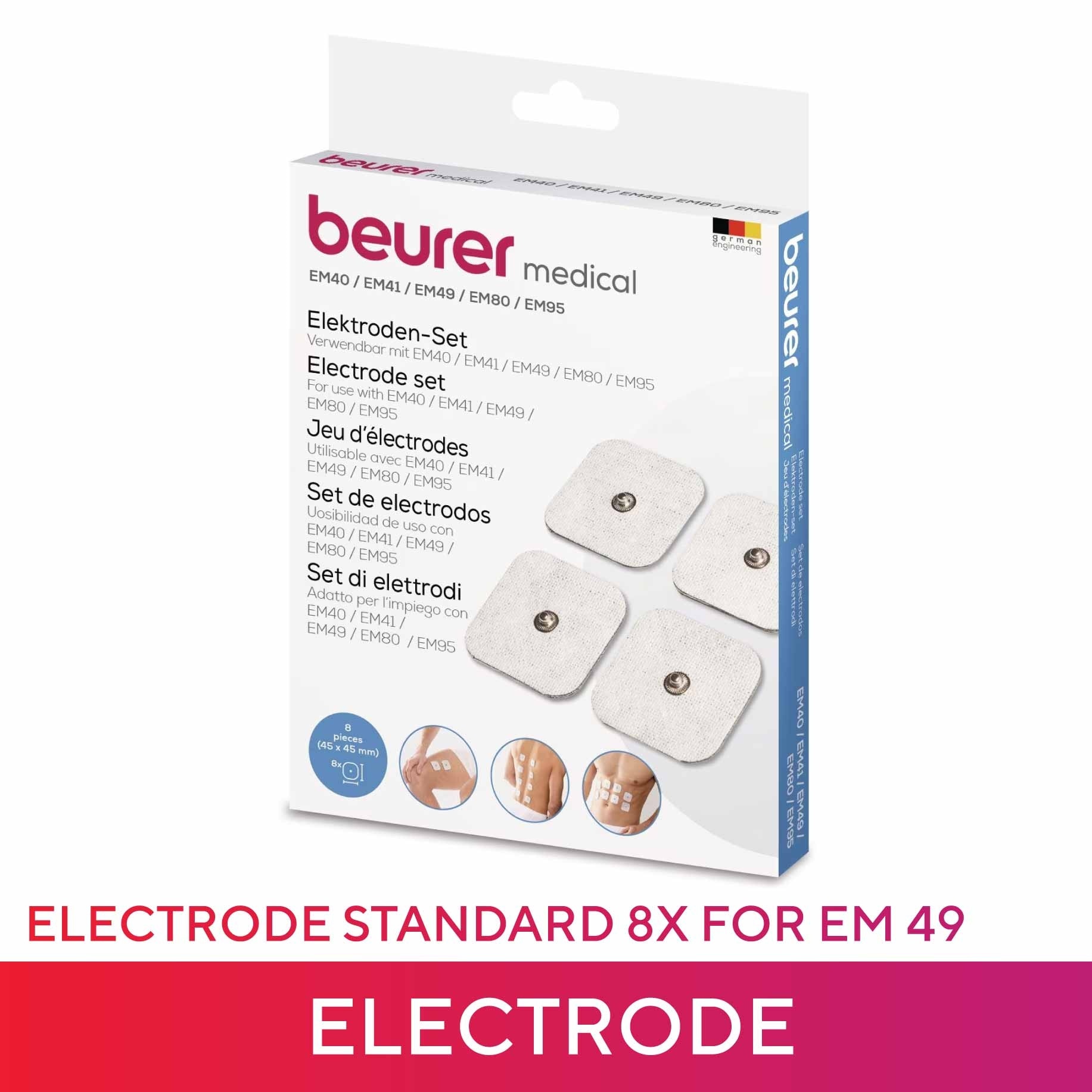 Attach the self-adhesive gel pads to the snap buttons on the electrode cables. Ensure your skin is clean, dry, and free from lotions or oils where the pads will be placed. To use Beurer EM 49 replacement pads, connect them via snap buttons to the device's cables, attach them to clean, dry skin around the pain/target area (avoiding spine/bony spots), choose a program (TENS for pain, EMS for muscle), adjust intensity for desired sensation (tingle for TENS, strong contraction for EMS), and run the session, ensuring pads are placed effectively for treatment.