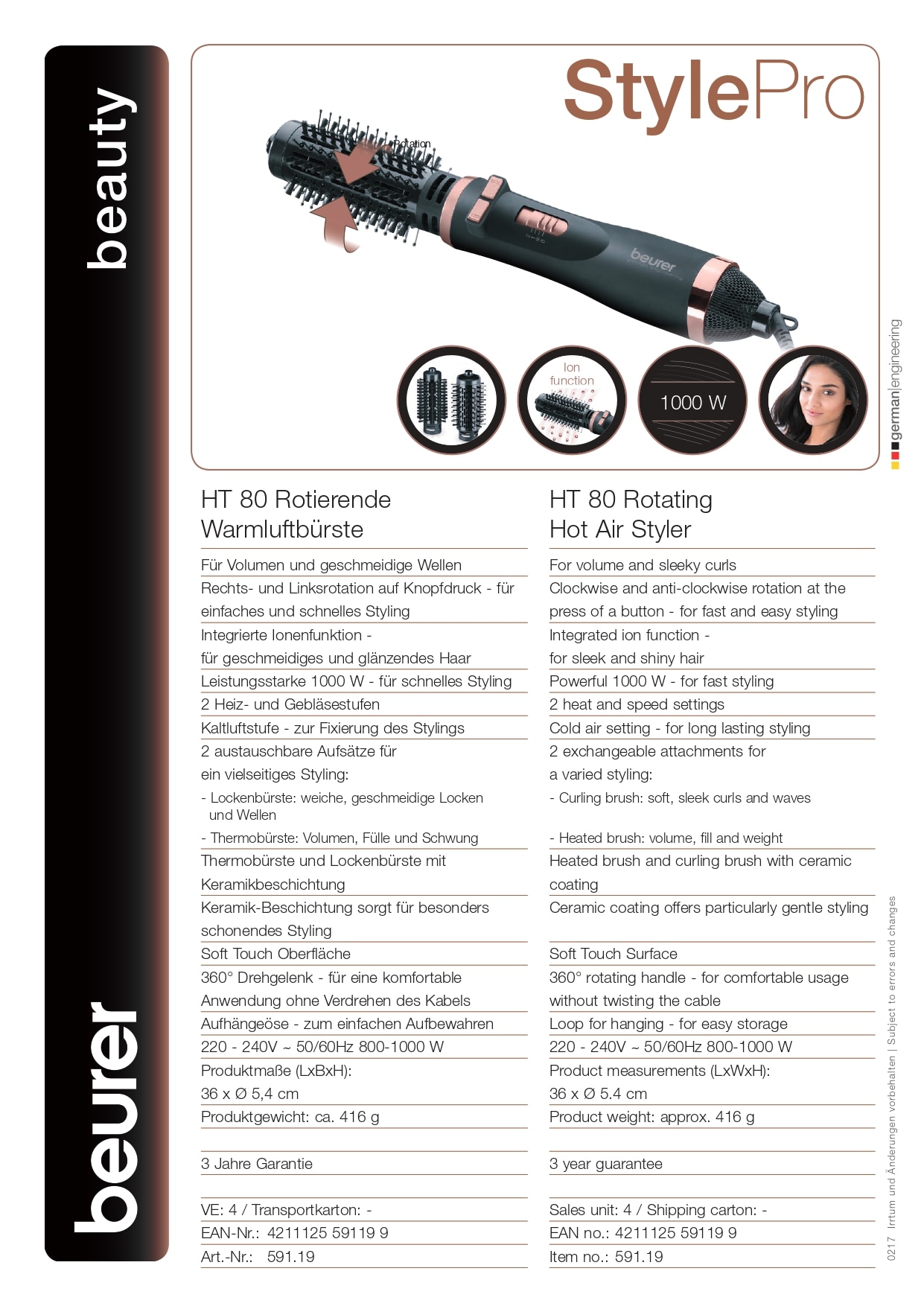 The HT 80 Rotating Hot Air Brush from Beurer with 2 interchangeable attachments provides a simple way to style your hair in minutes: Use the heated brush to add volume, body and bounce to your hair, and the curling brush to create soft, supple curls and waves.