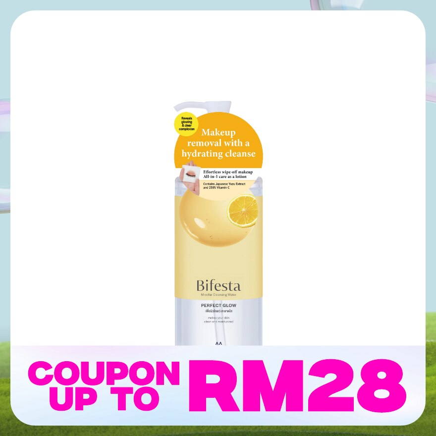 Bifesta Micellar Cleansing Water Perfect Glow 400ml is suitable for dull & uneven-toned skin types, promising to improve skin radiance and achieve a glowing complexion. It contains 2.5 times the impressive concentration of Vitamin C*, working to minimize dullness and roughness, revealing smooth and even skin. It is enriched with Citrus Junos Fruit Extract which is workable in moisturizing but also serves as a skin conditioner. The inclusion of Japanese YUZU** helps to keep skin hydrated and lock in moisture. Besides, this cleansing water consists of Pullulan that works as a film on skin surface protecting pollution and moisture loss. Additionally, the low friction formulation features dust removing, pollen, PM2.5 and other adhering component gently & effectively. This cleansing water comes with 3-In-1 Beauty Benefits which includes multi-functions formula cleanses skin, removes makeup and moisturizes skin all in one simple step. Besides, this cleansing water is formulated with cleansing ingredients derived from lotions, this formula expertly envelops and lifts makeup stains and gently eliminating any residual traces without double cleansing needed. It is also infused with elevated moisture content by ensuring your skin retains moisture while effectively removing makeup and dirt. This micellar cleansing water can be applied to replace facial wash product & perform daily activities without any hassie.
