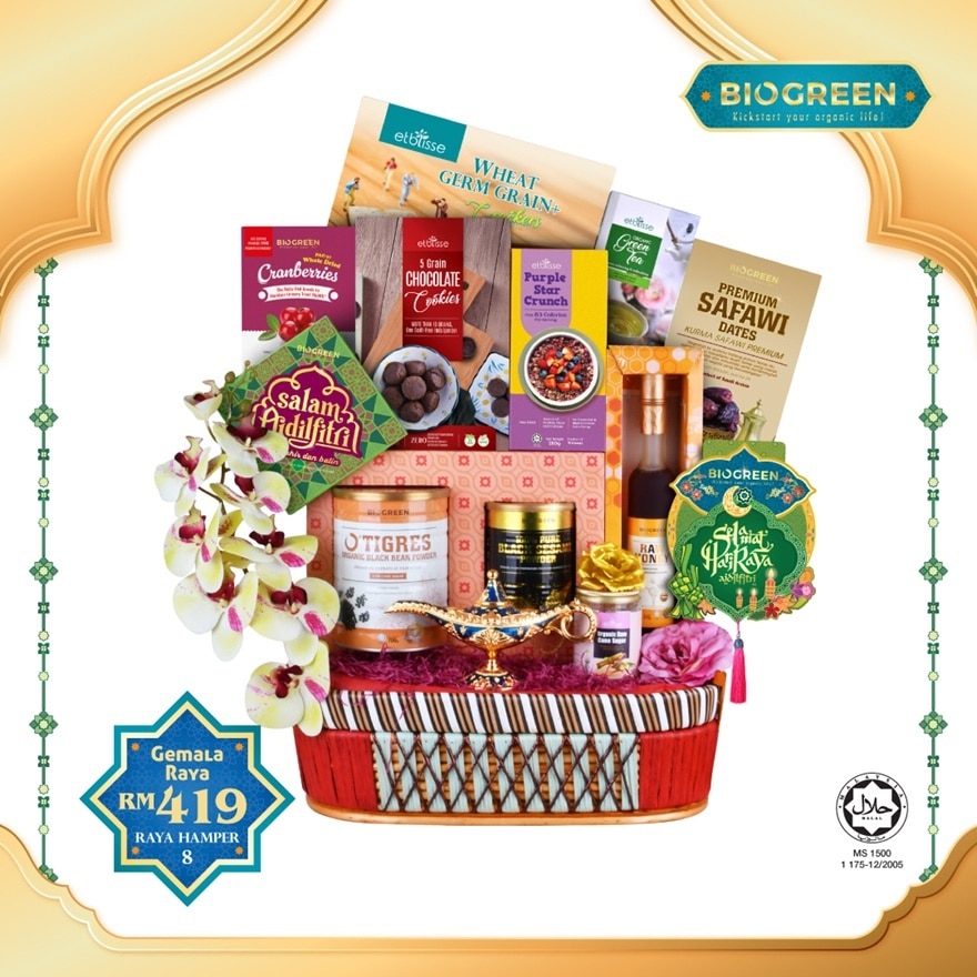 Premium Aladdin Magic Lamp Exquisite Crafts, Biogreen O'Tigres Organic Black Bean Powder Low Sugar 700g (Tin), 100% Pure Black Sesame Powder 300g, Premium Safawi Dates 180g (Arab Saudi), Raw Honey 510g, PAC-37 Whole Cranberries 110g, Etblisse 5 Grain Chocolate Coconut Cookies (Box) 16x10g, Purple Star Crunch 110g, Wheat Germ Grain Cracker 26g x 8pkts (Box), Raw Cane Sugar 280g, Organic Green Tea 8x2g, Salam Ketupat (Supergreen 30g + Purple Chia Soy 30g. (This item does not support East Malaysia)