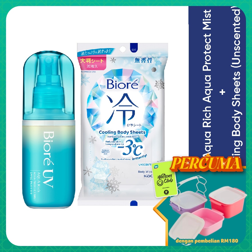 Biore UV Aqua Rich Aqua Protect Mist SPF50 PA provides quick and even UV coverage with a water-light mist for easy application, forming a thin, non sticky, dewy UV film that adheres smoothly to skin without white cast, locks in moisture with squalane, offers strong water resistance, and can be removed with soap, while its fresh citrus fragrance makes it suitable even over makeup; the accompanying body wipes contain menthol and hyaluronic acid to instantly cool skin surface temperature by negative 3 C, remove sweat, sebum and odour with thick, durable 23 cm 20 cm sheets that deliver a long-lasting cooling sensation just one sheet is enough for the entire body (after two rounds of wiping), allergy tested and non comedogenic, with 20 sheets per pack.