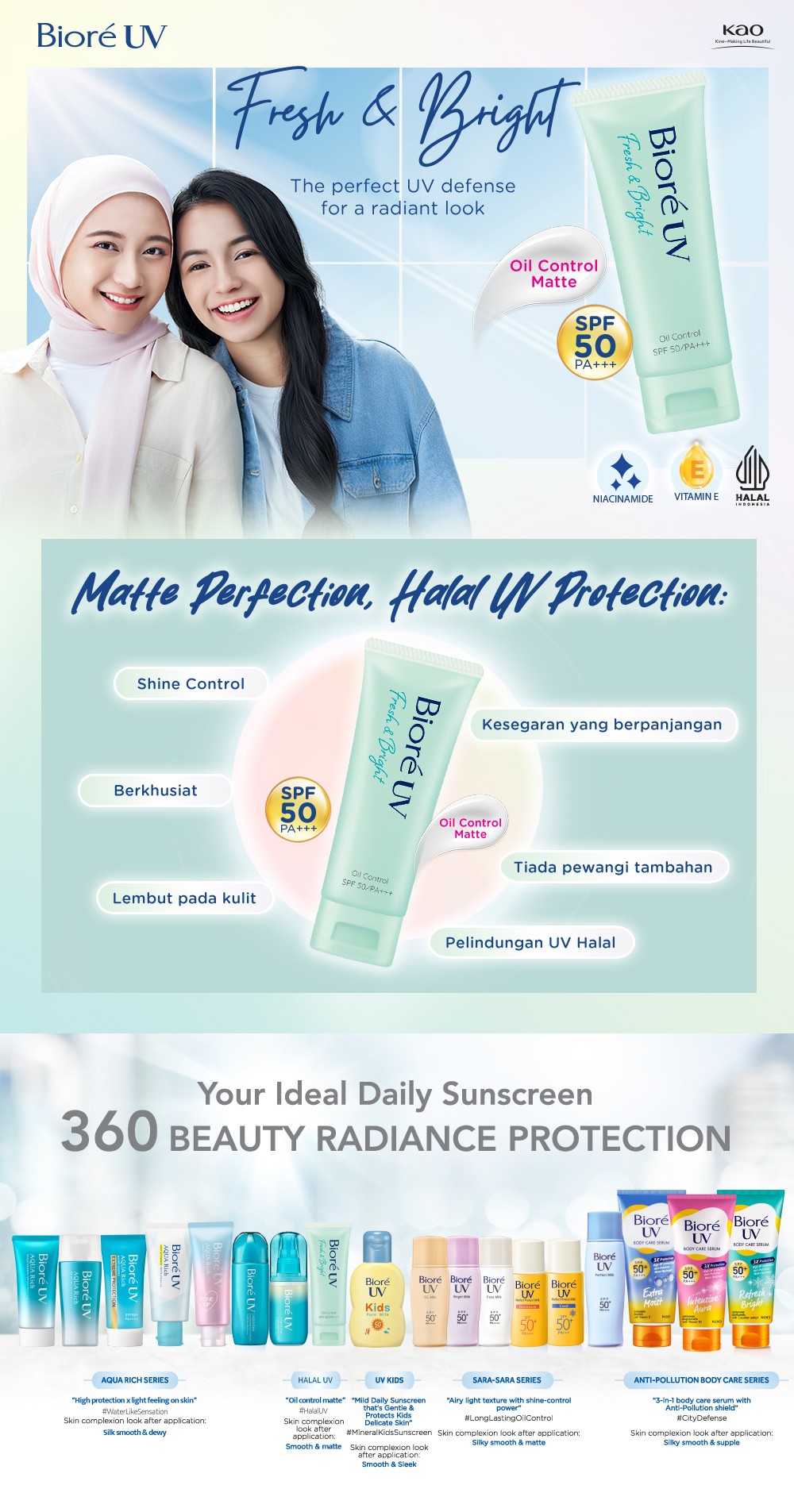 BIORE UV FRESH&BRIGHT OIL CONTROL MATTE SPF50/PA+++ Advanced 3-in-1 Formulation 1. Broad Protection from UVA & UVB Rays. 2. Regulate Excess Sebum with Shine-Control Formula. 3. Niacinamide and Vitamin E for Brighter, Smoother Skin. SUITABLE FOR DAILY USE Dermatologically & Non-Comedogenic Tested Halal-Certified Water-resistant No White Cast No Added Fragrance Suitable as Makeup Primer