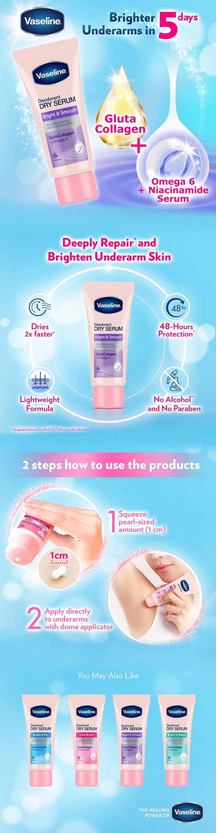 Only Vaseline Deodorant Dry Serum contains unique blend of Collagen booster and Vitamin B3 that penetrates to the outer skin layer and repairs damage at the source so you get visibly whiter and smooth underarm.