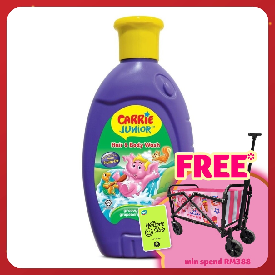 CARRIE JUNIOR has Colourful and eye catching packaging in vibrant colour and elephant toe bottle shape to attract kids. For Gentle And Effective Cleansing Of Baby'S Hair And Entire Body, Carrie Junior Baby Hair & Body Wash Is Enchanced With Fruito-E.