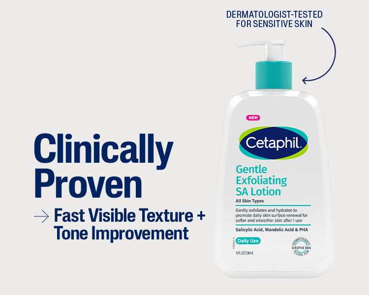 CETAPHIL GENTLE EXFOLIATING SA LOTION: Gently cleanses and exfoliates to promote surface skin cell renewal for smooth, even and radiant-looking skin after just 1 use
