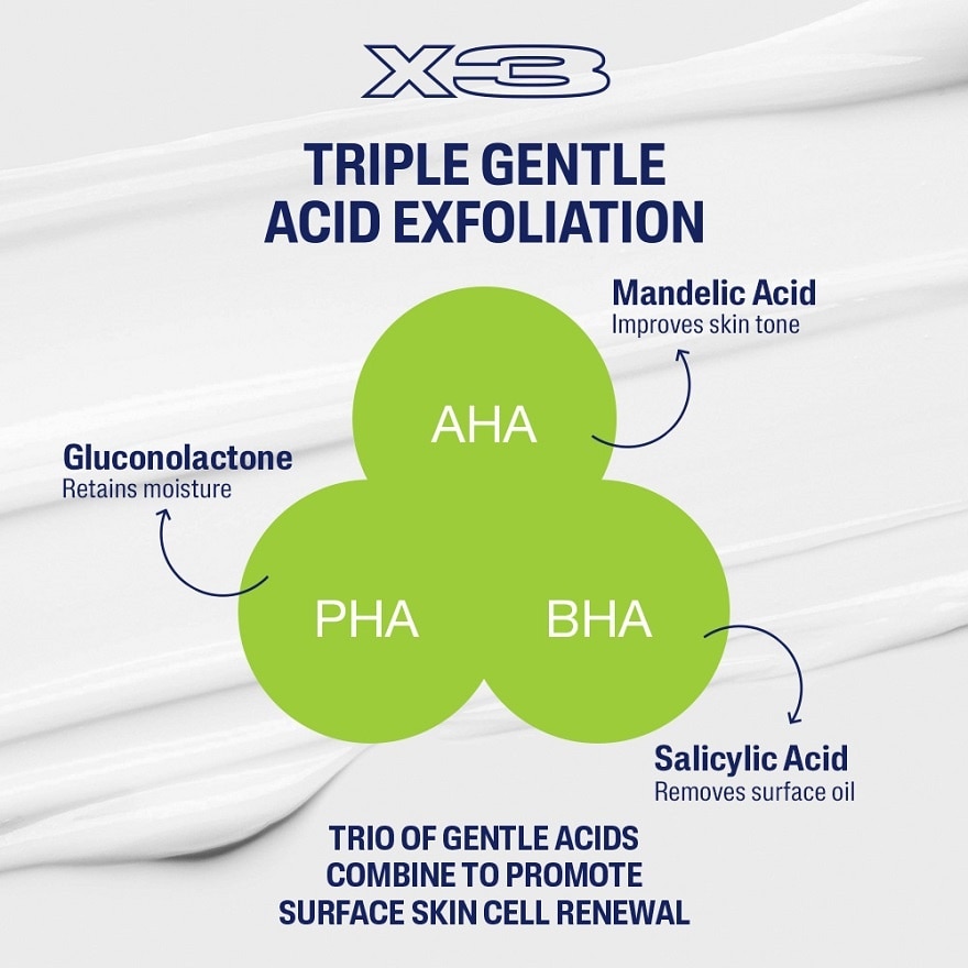 • IMPROVE TEXTURE AND TONE: Formulated with a unique triple acid blend of Salicylic Acid, Mandelic Acid and Gluconolactone, designed to remove excess oil, improve skin tone and retain skin's moisture while exfoliating