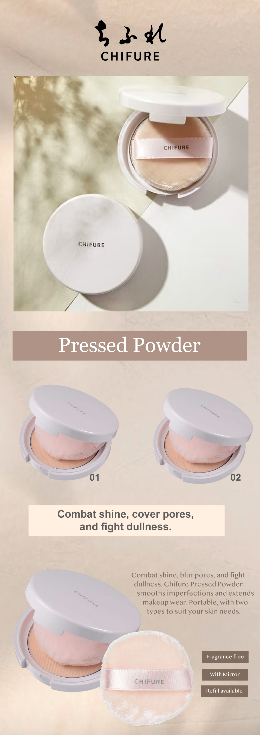 Apply Chifure Pressed Powder to your face as the final step of your makeup routine to combat shine, cover pores, and enhance makeup durability according to your skin concerns.