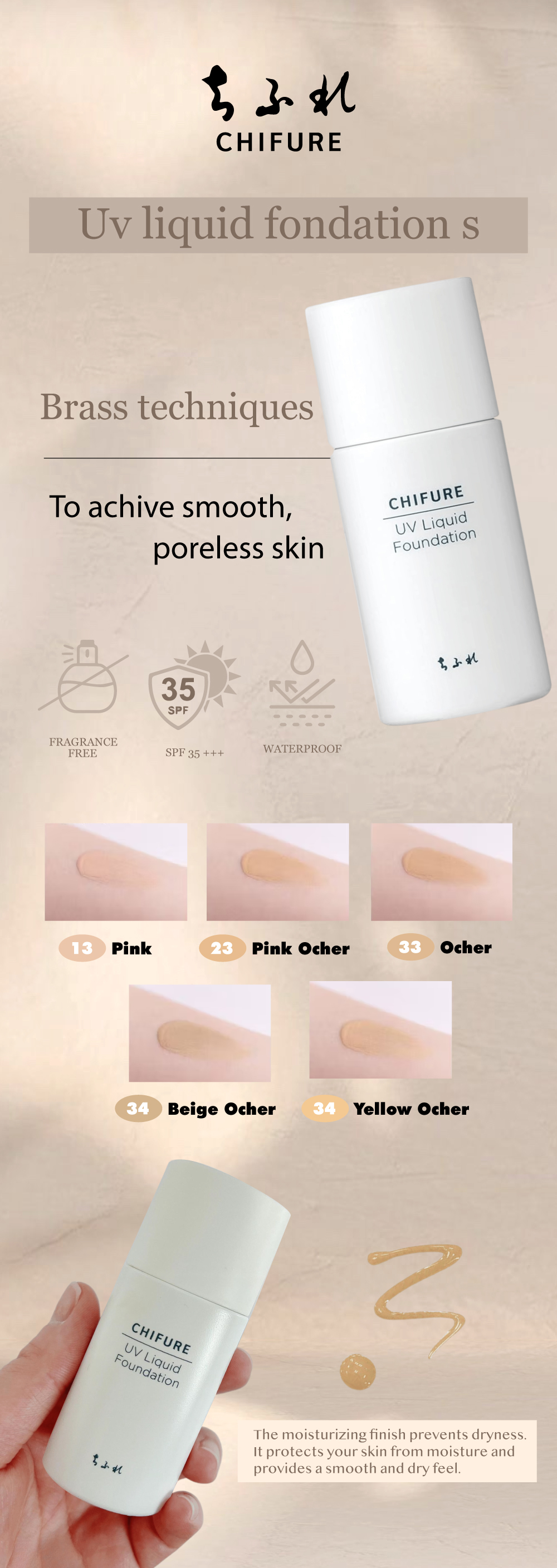 Apply Chifure UV Liquid Foundation evenly onto your skin for long-lasting, natural coverage and sun protection without needing primer or powder.