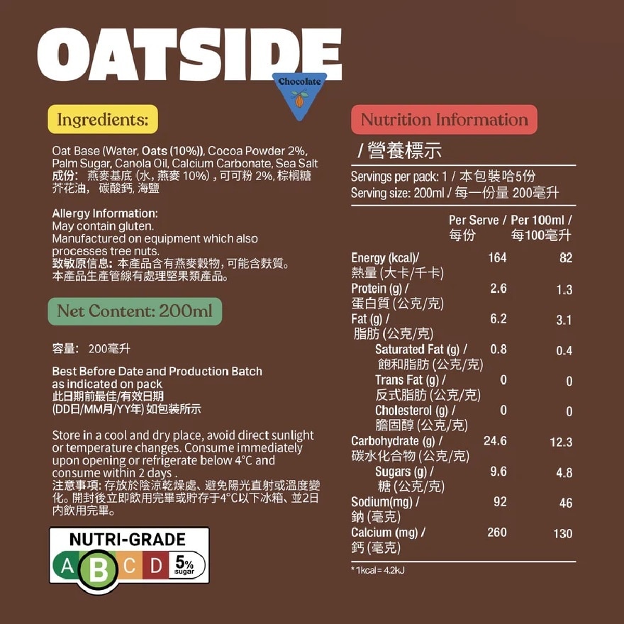 Oat Base (Water, Oats (10%)), Cocoa Powder 2%, Palm Sugar, Canola Oil, Calcium Carbonate, Sea Salt