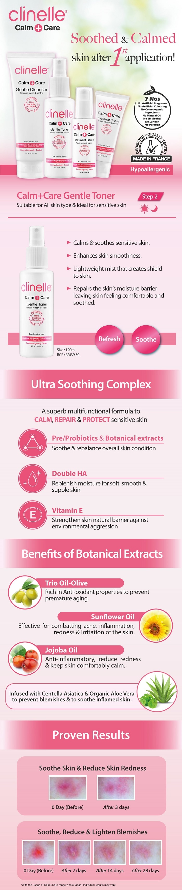 Gently pat toner into skin until fully absorbed.For happy skin happy face, follow with Clinelle Calm+Care skin care range.