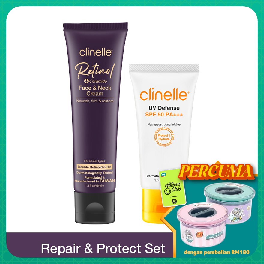 CLINELLE UV Defense SPF50 PA+++ 30mlAqua, Butylene Glycol, Glycerin, Ethylhexyl Methoxycinnamate, Butyl Methoxydibenzoylmethane, 1,2 Hexanediol, Benzophenone-3, Phospholipids, Arginine, Carbomer, Phenoxyethanol, Polysorbate 20, Xanthan Gum, Aloe Barbadensis Leaf Extract, Glycogen, Rosmarinus Officinalis (Rosemary) Leaf Water, Lavandula Angustifolia (Lavender) Flower Water, Jasminum Officinale (Jasmine) Flower Water, Chamomilla Recutita (Matricaria) Flower Water, Mentha Piperita (Peppermint) Leaf Water.CLINELLE Retinol + Ceramide Neck Cream 40mlWater, Caprylic/Capric Triglyceride, Glycerin, Simmondsia Chinensis (Jojoba) Seed Oil, Cetearyl Olivate, Sodium Polyacrylate, Butylene Glycol, Coco‐Caprylate/Caprate, Propanediol, Dimethyl Isosorbide, Sorbitan Olivate, Glyceryl Stearate, Hydroxyacetophenone, PEG‐100 Stearate, Tocopheryl Acetate, Hydroxyethyl Acrylate/Sodium Acryloyldimethyl Taurate Copolymer, Phenoxyethanol, Betaine, Bellis Perennis (Daisy) Flower Extract, Isohexadecane, Potassium Hydroxide, Capryloyl Salicylic Acid, Cetyl Alcohol, Hydroxypinacolone Retinoate, Panthenol, Hydrogenated Lecithin, Polysorbate 60, Scutellaria Alpina Flower/Leaf/Stem Extract, Sorbitan Isostearate, Ceramide NP, Hyaluronic Acid, Sodium Hyaluronate, Hydrogenated Macadamia Seed Oil, Chamomilla Recutita (Matricaria) Flower Extract, Copernicia Cerifera (Carnauba) Wax, Decyl Glucoside, Potassium Sorbate, Palmitoyl Tetrapeptide‐7, Retinyl Palmitate, Pentylene Glycol, Sodium Benzoate, Citric Acid, Lecithin