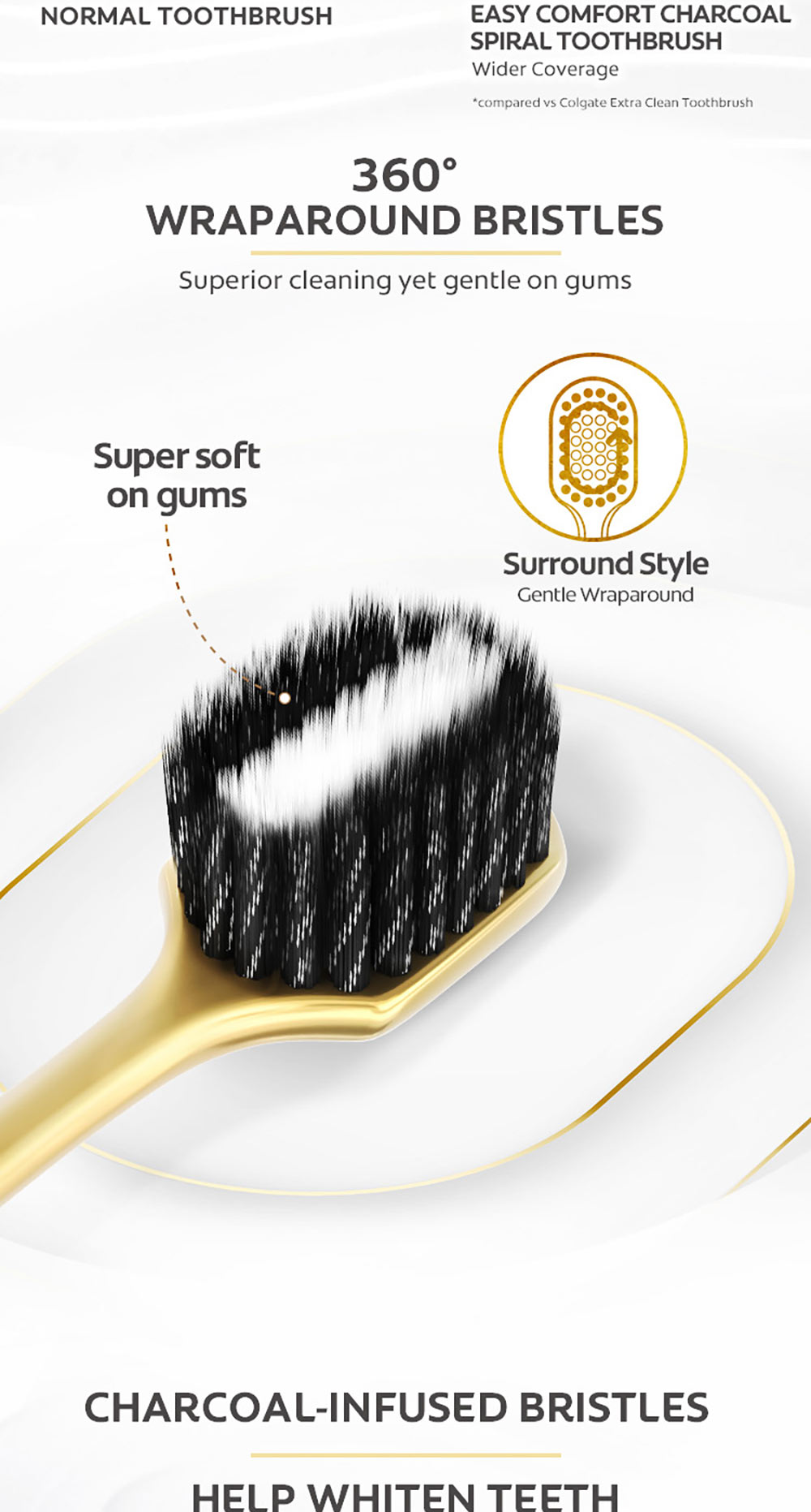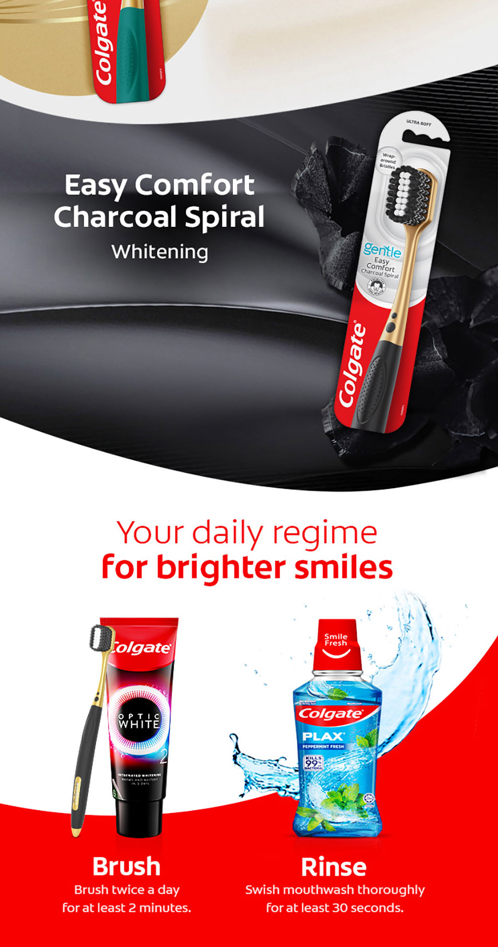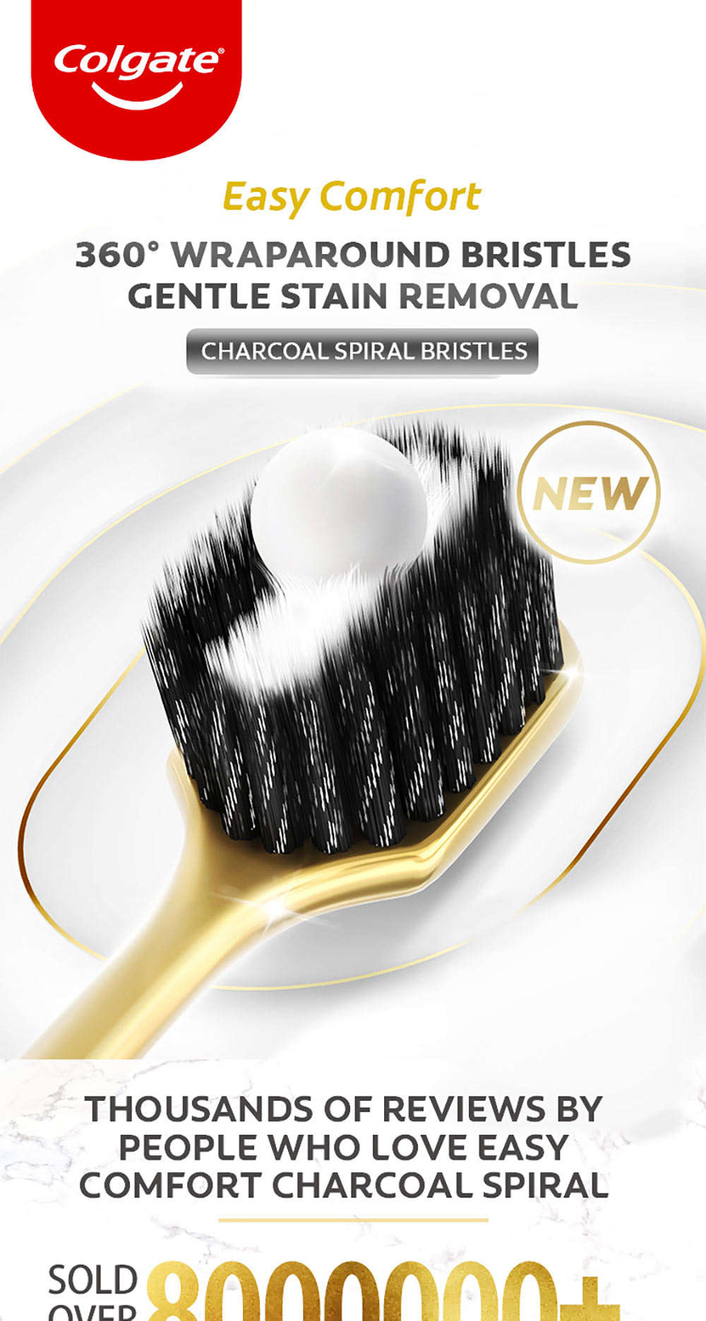 Colgate Easy Comfort Charcoal Spiral Super Soft toothbrush comes equipped with charcoal infused spiral bristles. Its bi-level design helps whiten teeth by removing surface stains. Its 15mm wide head design has 137%* more bristles for wider reach ensuring greater coverage while you brush while providing gentle gum cleaning. The Colgate Easy Comfort Charcoal Spiral toothbrush also comes with a soft rubber handle for an ergonomic grip giving you comfortable control every time you brush your teeth.