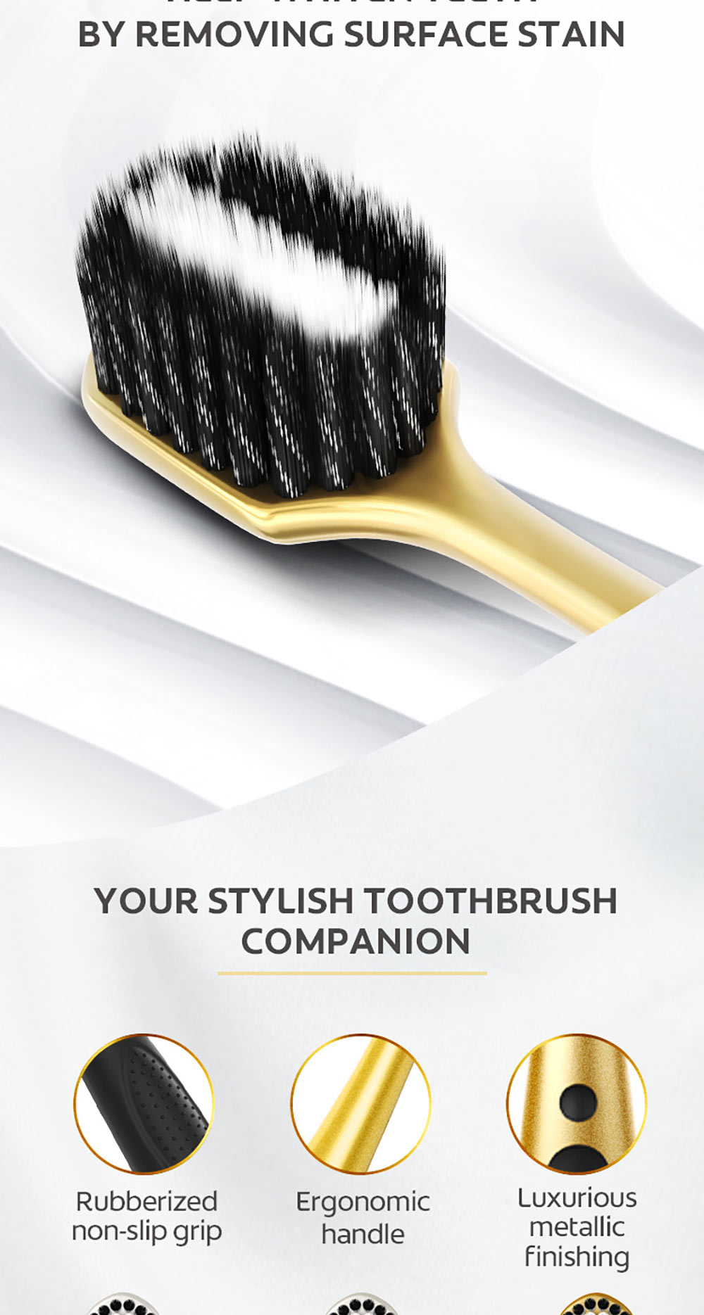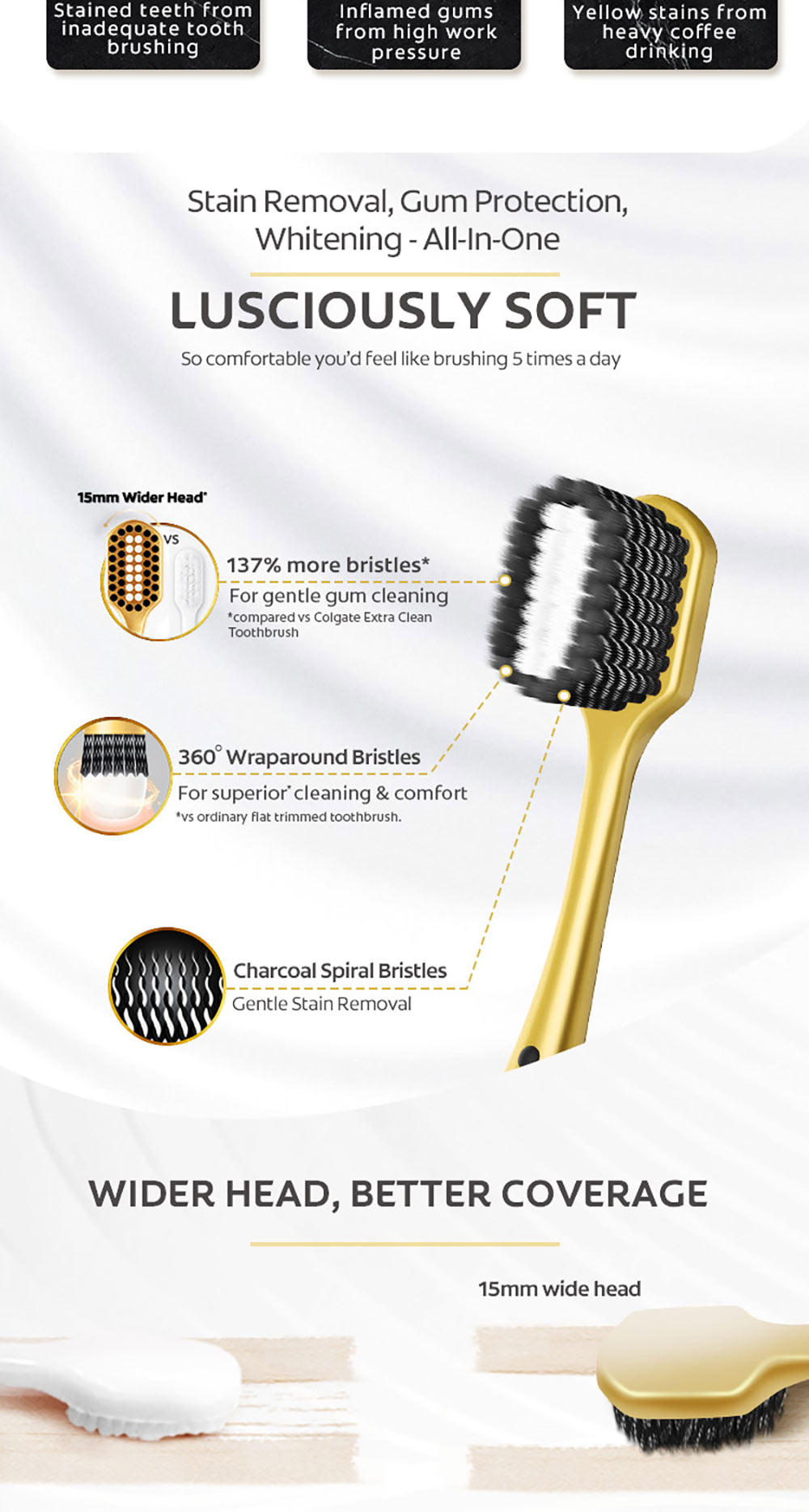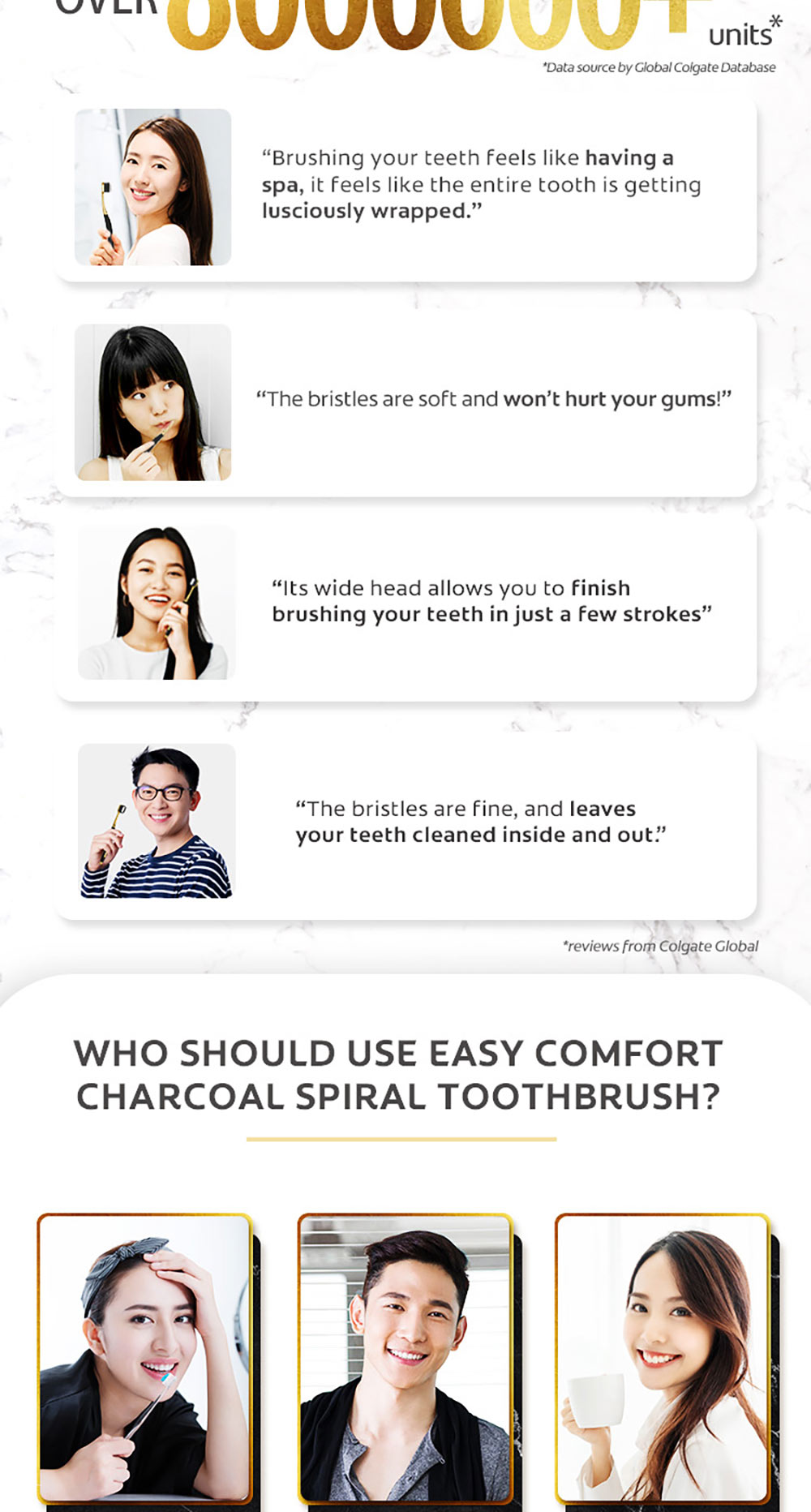 Colgate Easy Comfort Charcoal Spiral Super Soft toothbrush comes equipped with charcoal infused spiral bristles. Its bi-level design helps whiten teeth by removing surface stains. Its 15mm wide head design has 137%* more bristles for wider reach ensuring greater coverage while you brush while providing gentle gum cleaning. The Colgate Easy Comfort Charcoal Spiral toothbrush also comes with a soft rubber handle for an ergonomic grip giving you comfortable control every time you brush your teeth.