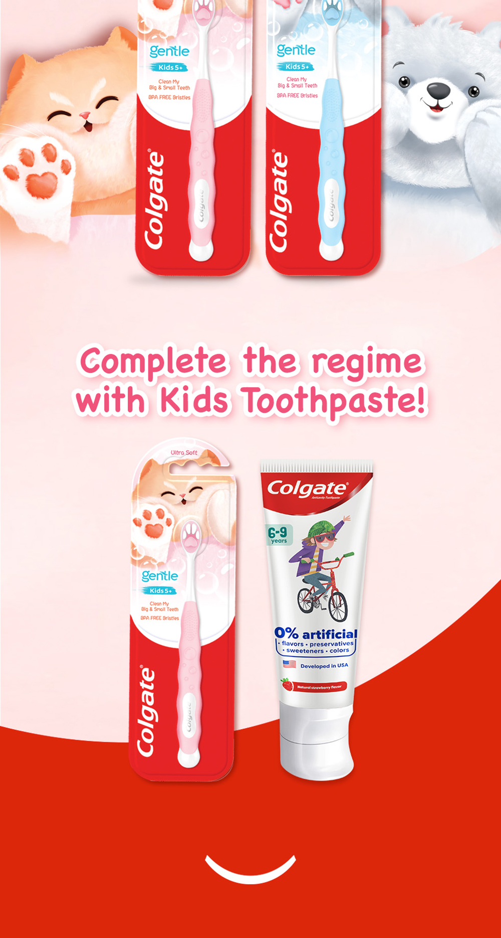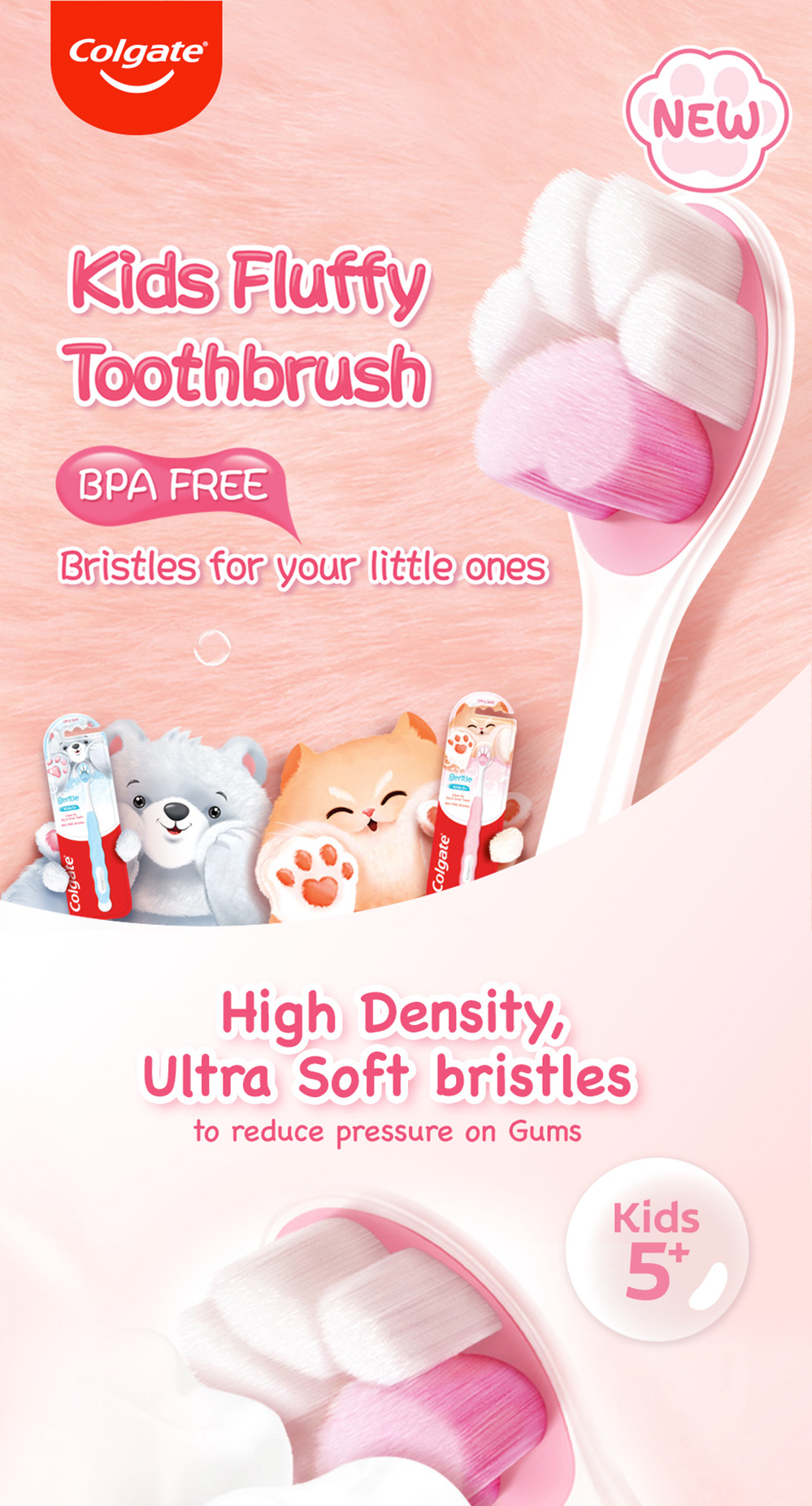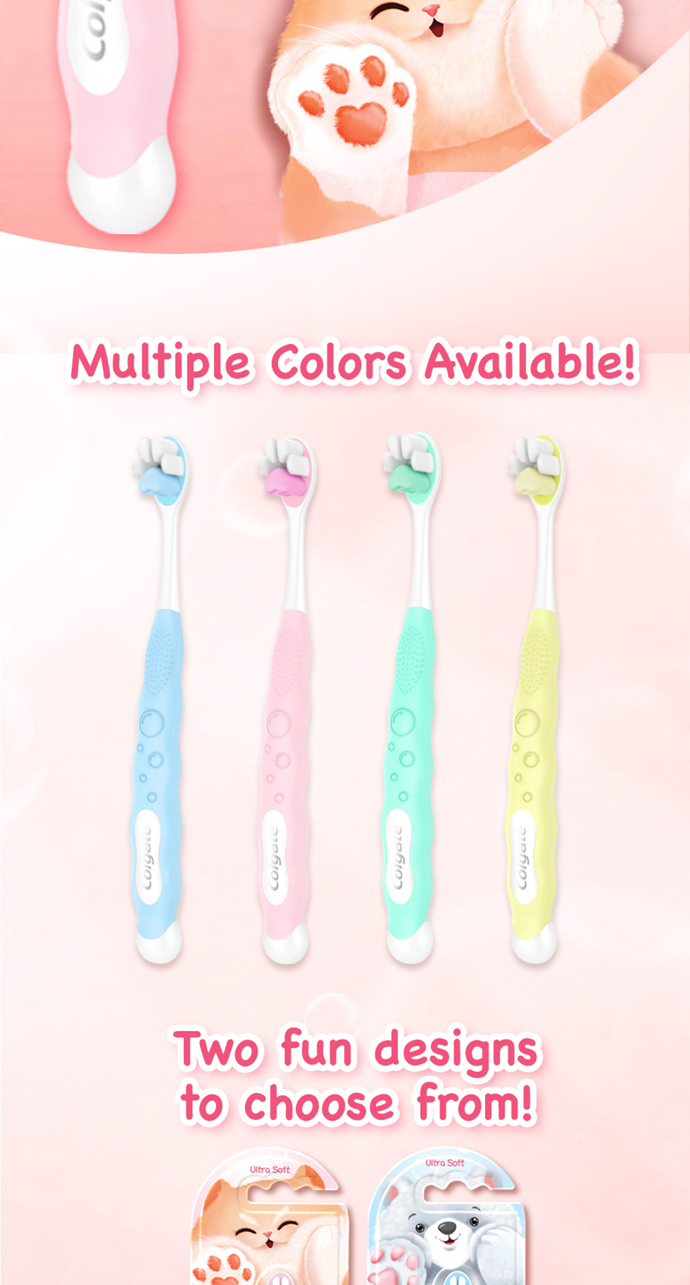 Colgate Animal Paw kids toothbrush is designed for gentle cleaning, and overall positive brushing experience for children. It has an ultra soft, small toothbrush head that fits easily in a child's mouth, easing the brushing experience. The bristles are BPA-FREE and safe for children to use. Its high density bristles also helps reduce pressure on kid's gums while brushing. The bristles are designed in a shape that guides parents to dispense the right pea-sized amount of toothpaste each time. This toothbrush comes with a handle that is made from non-slip soft rubber, making it easy, steady and comfortable - the perfect fit for a child's hand! There are 4 fun colours available for kids to choose their favourite colour!