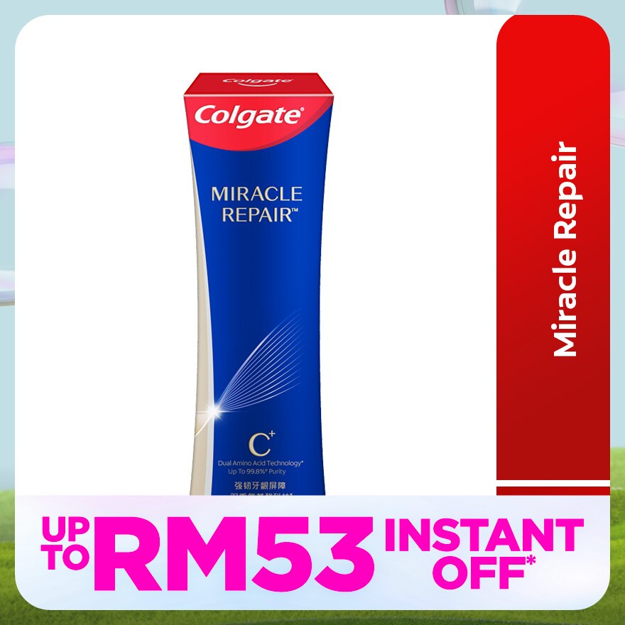 Colgate Miracle Repair toothpaste contains 98.5% pure Amino Acid which helps prevent root causes* of gum recession. With twice a day brushing, Colgate Miracle Repair helps in gum revival by reducing dental plaque & tartar formation** on your teeth, therefore improving gum health^. It also gives you a pleasant brushing sensorial experience with a unique cool Jasmine flavour. Try it today to preserve your youthful, ageless smile!
