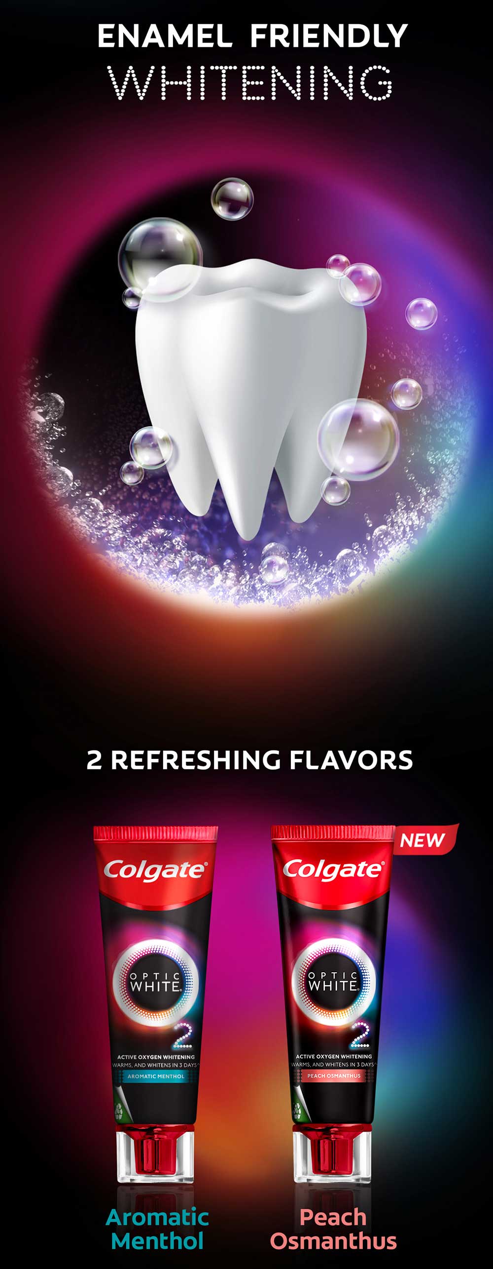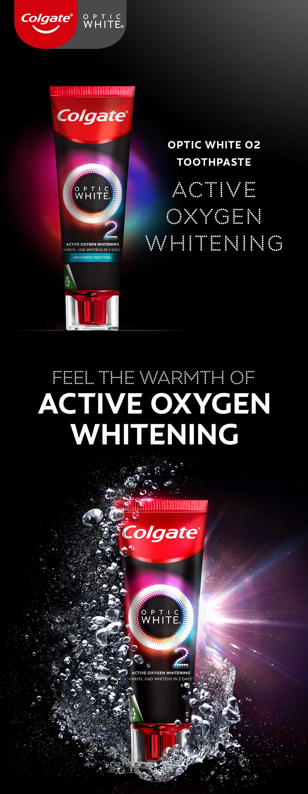 NEW Colgate® Optic White O2 Aromatic Menthol toothpaste with Active Oxygen Bubble technology - Oxygenated whitening toothpaste that heats to whiten in 3 days.