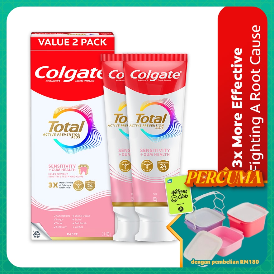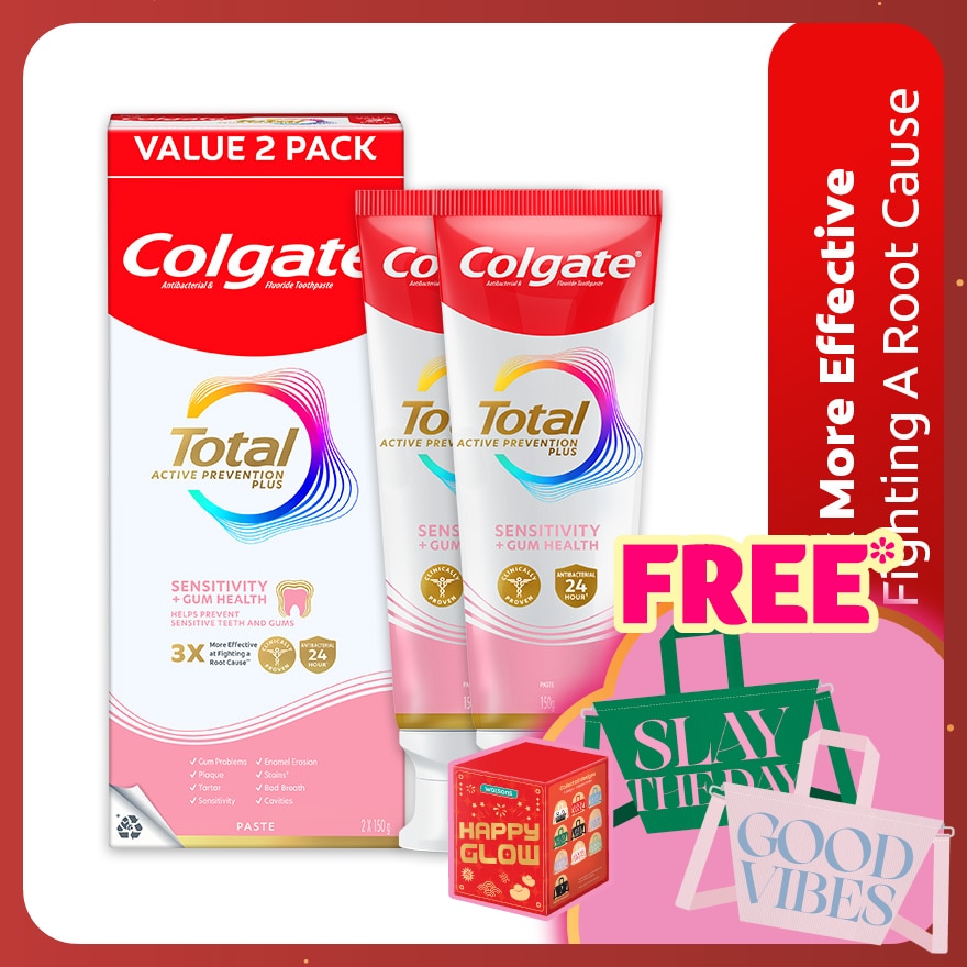 The new Colgate® Total Sensitivity + Gum Health Toothpaste with Active Prevention Plus is 3x more effective at fighting a root cause* of top oral issues such as Gum Problems, Plaque, Tartar, Sensitivity, Bad Breath, and Cavities. Its Powerful, Patented, Preventative Technology is clinically proven to provide 24-hour antibacterial action**, which provides long-lasting benefits against bacteria to help prevent 8 oral care problems before they start.