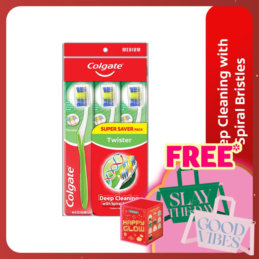 Colgate Twister toothbrush cleans in multiple dimensions. With unique twister bristle pattern, it cleans in between teeth and along gum line. Curved trim bristles to fit the contours of your teeth and clean the surfaces.
