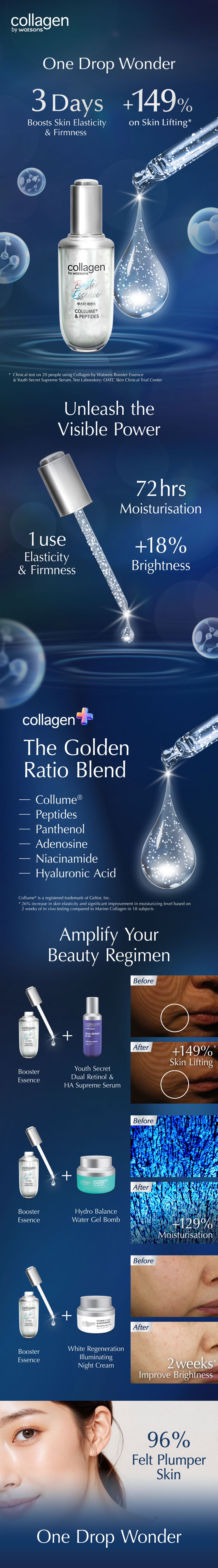As a pre-essence, use morning and night after cleansing and toning. Apply an adequate amount and massage onto face and neck. As a booster, simply mix 1-2 drops with your preferred Collagen by Watsons serum or moisturiser for even better results.