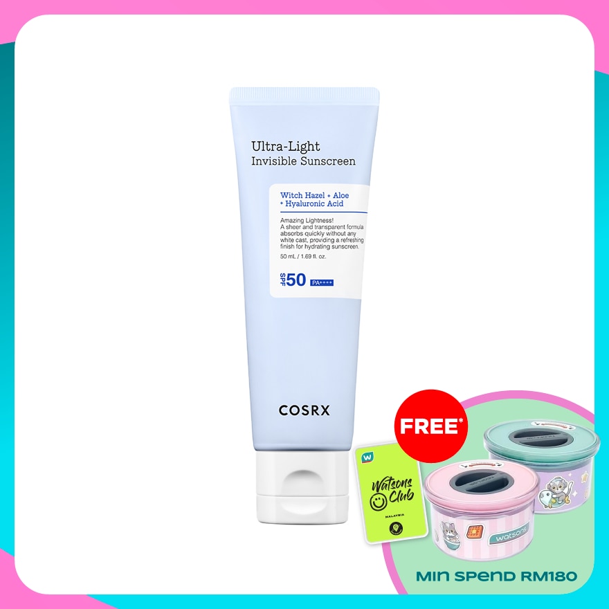 Information The COSRX Ultra Light Invisible Sunscreen is a SPF 50+ PA+++ broad-spectrum sunscreen known for its lightweight, non-greasy texture that absorbs quickly into the skin. It provides invisible sun protection suitable for various skin tones, contains soothing ingredients like Aloe and Witch Hazel and is designed to be gentle on sensitive skin. Its water-resistant formula makes it ideal for daily use and outdoor activities. Ingredients We Love: Aloe Babadensis Leaf Water, Hamamelis Virginiana, Niacinamide, Tocopherol, Adenosine This product is exclusively distributed by GLAMPICK. Features/Benefits - Sensitive Skin Irritation Tested - Skin irritation test completed - Ocular Irritation Tested - Invisible, no-white cast - Lightweight, non-greasy Ingredients subject to change at manufacturer's discretion. For the most complete and up-to-date list of ingredients, please refer to product packaging.