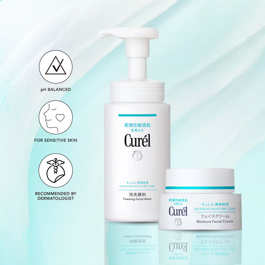 Dispense 2 pumps of Curél Foaming Facial Wash into your palm. Apply the foam onto wet skin. The light lather thoroughly removes impurities without washing away your skin’s natural ceramides. Gently pat dry. When you dont need to remove any makeup (i.e. in the morning), use the Foaming Facial Wash on its own. Apply a grape size amount of Curél Intensive Moisture Facial Cream to cheeks, forehead, nose and chin. Smooth cream over your face, working from the inside to the outside in long, soft strokes.