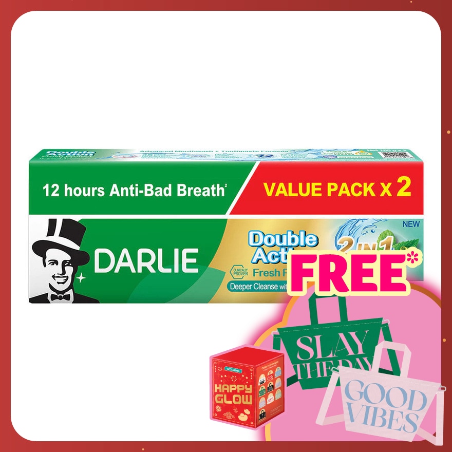 1st in Malaysia DARLIE Double Action Fresh Protect 2In1 Mouthwash + Toothpaste gives you stronger 12-hour bacterial defense¹ and lasting fresh breath against bad breath² with its natural mint essence and a formula that kills 99.9% of bacteria.