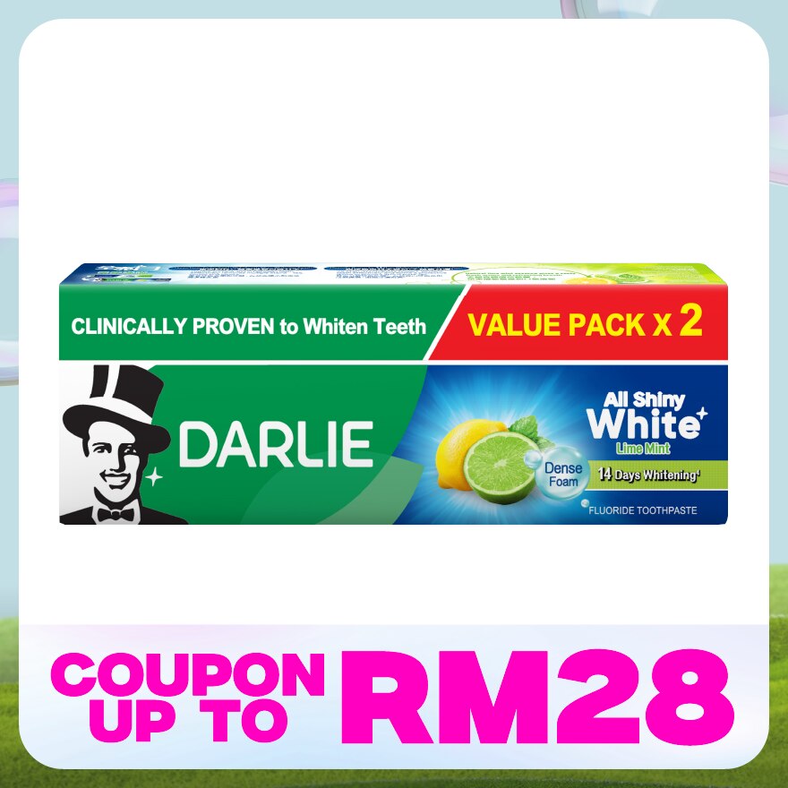 4) Compare to Darlie All Shiny White before formulation upgrade. 5) Darlie All Shiny White Lime Mint made with a SWA whitening system that delivers surface stain dissolvability power. It has a balanced blend of lime and fresh mint that keeps your mouth tingling with a sensation of natural freshness.