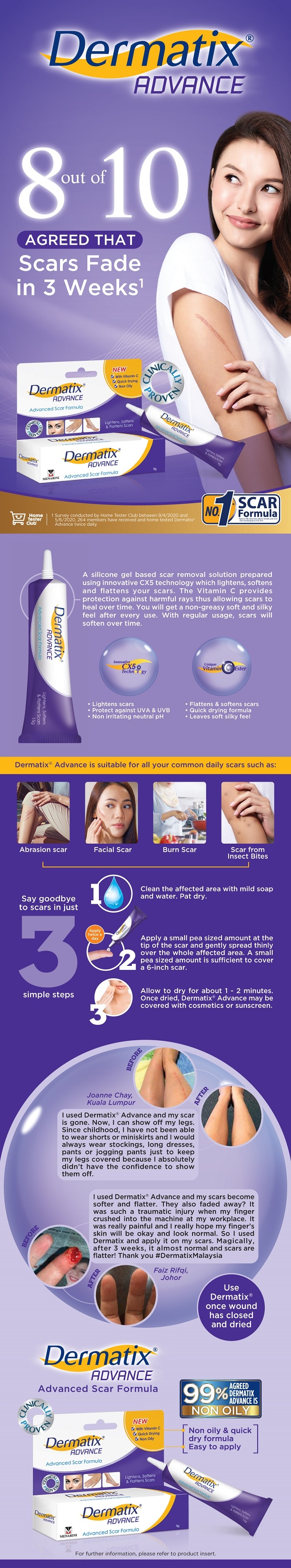 Dermatix Advance is clinically proven specialised scar formula with CX5 Technology and Vitamin C ester that lightens, softens and flattens scars. It provides a protective layer to keep skin hydrated. This promotes healing and reduces redness and itchiness.