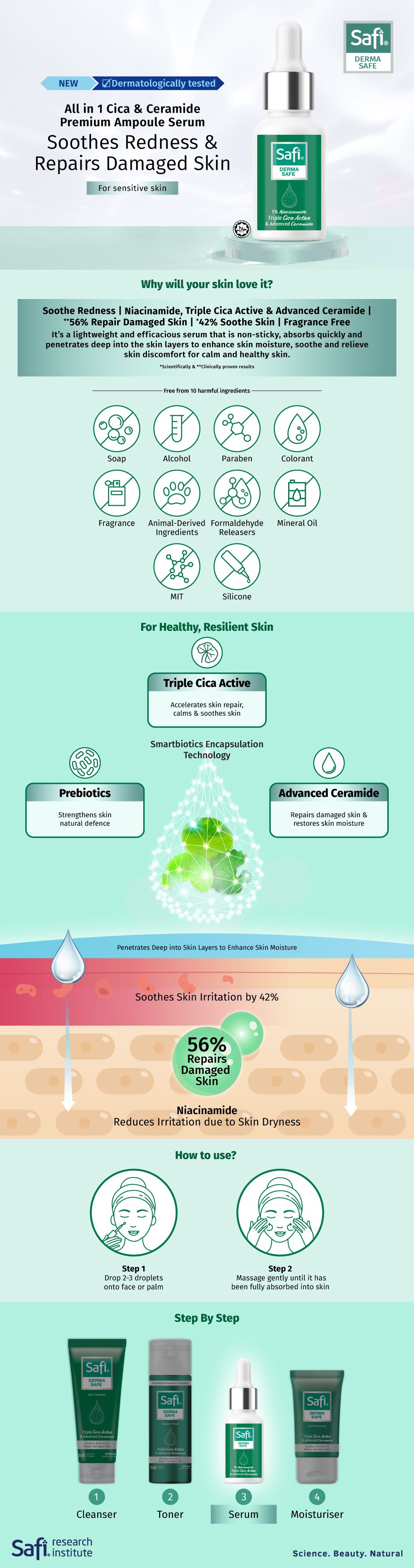 Lightweight and efficacious serum that is non sticky, quick absorption and penetrates deep into the skin layers to enhance skin moisture, soothe and relief skin discomfort for calm and healthy skin. Smartbiotics Encapsulation Technology that provides All-in-1 solutions with Triple Cica Active & Advanced Ceramide intelligently helps to soothe irritation, reduce skin redness and repair damaged skin for healthy resilient skin. Triple Cica Active- ,Soothes skin & Reinforce skin barrier; Advanced Ceramide- Repairs damaged skin & restores skin moisture; Chamomile- Reduce skin redness & relief skin discomfort; Niacinamide- Reduces irritation due to skin dryness; Prebiotic- Strengthen skin natural defence