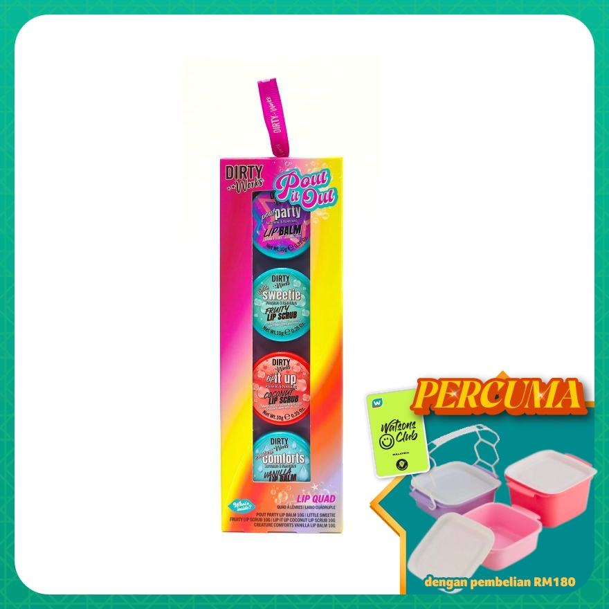 POUR PARTY LIP BALM – Petrolatum, Mineral Oil (Paraffinum Liquidum, Huile Minerole), Polyisobutene, Cetearyl Ethylhexanoate, Butyrospermum Parkii (Shea) Butter, Beeswax (Cera Albo, Cire d’abeille), Synthetic Beeswax, Tocopheryl Acetate, Prunus Amygdalus Dulcis (Sweet Almond) Oil Benzyl Alcohol, Fragrance (Parfum), Tocopherol, Hexyl Cinnamal, Tetramethyl Acetyloctahydronaphthalenes, Benzyl Salicylate, Linalool, Limonene, Citrus Limon Peel Oil, Linalyl Acetate, Dimethyl Phenethyl Acetate, Vanillin, Red 6 Lake (Cl 15850). LIP IT UP COCONUT LIP SCRUB – Sucrose, Polyisobutene, Cocos Nucifera (Coconut) oil, Caprylic/Capric Triglyceride, Simmondsia Chinensis (jojoba) Seed Oil, Beeswax (Cera Alba, Cire d’Abeille), Ethylthexyl Palmitate, Fragrance (Parfum), Macadamia Ternifolia Seed Oil, Prunus AmygdalusDulcis (Sweet Almond) Oil, Phenoxythanol, Tocopheryl Acetate, Benzyl Benzatate. CREATURE COMFORTS VANILLA LIP BALM - Petrolatum, Mineral Oil (Paraffinum Liquidum, Huile Minerole), Polyisobutene, Cetearyl Ethylhexanoate, Butyrospermum Parkii (Shea) Butter, Beeswax (Cera Albo, Cire d’abeille), Synthetic Beeswax, Tocopheryl Acetate, Prunus Amygdalus Dulcis (Sweet Almond) Oil Benzyl Alcohol, Fragrance (Parfum), Tocopherol LITTLE SWEETIE FRUITY LIP SCRUB – Sucrose, Polyisobutene, Cocos Nucifera (Coconut) oil, Caprylic/Capric Triglyceride, Simmondsia Chinensis (jojoba) Seed Oil, Beeswax (Cera Alba, Cire d’Abeille), Ethylthexyl Palmitate, Fragrance (Parfum), Macadamia Ternifolia Seed Oil, Prunus AmygdalusDulcis (Sweet Almond) Oil, Phenoxythanol, Tocopheryl Acetate, Benzyl Benzatate.
