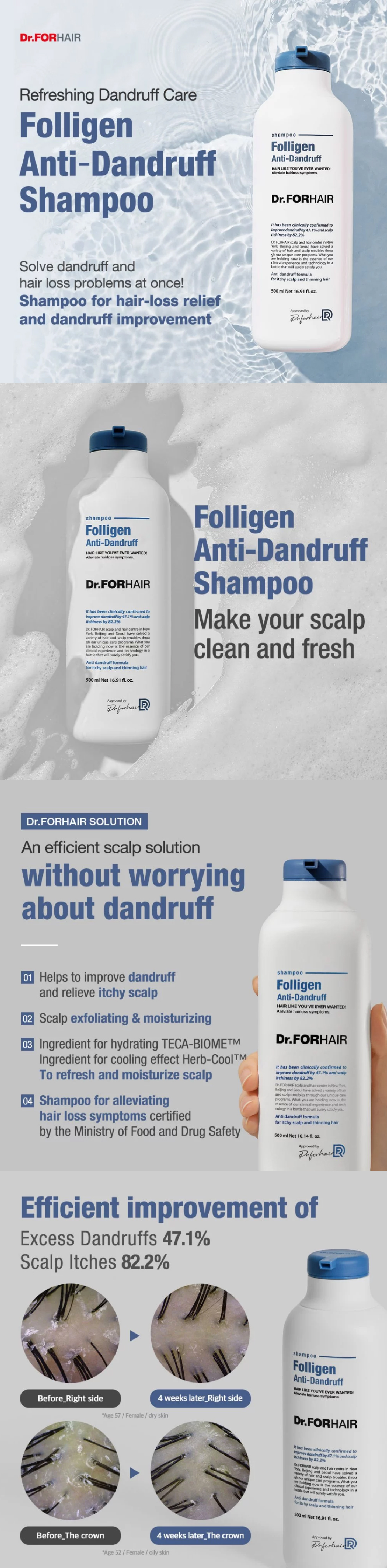 Dr.FORHAIR is a functional hair care brand providing effective solutions for various scalp types based on proven research and clinical experiments from our Scalp Care Center. Enjoy a pleasant change every day with us. Anti-dandruff formula for itchy scalp and thinning hair. A shampoo designed to alleviate hair loss symptoms while addressing excessive scalp flakes that cause itching and dandruff.