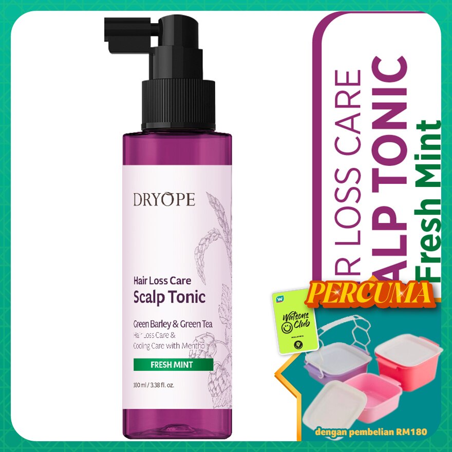 DRYOPE GREEN BARLEY HAIR LOSS CARE SCALP TONIC FRESH MINT. Experience the ultimate scalp and hair revitalization with our Botanical-Infused Hair Tonic. Specially formulated with a powerful blend of natural extracts, including Caffeine, Panax Ginseng, and Biotin, it stimulates hair follicles, promoting stronger, thicker hair growth. The refreshing touch of Menthol and Salicylic Acid soothes the scalp, controls excess oil, and helps combat dandruff and irritation. Infused with 24 botanical extracts like Green Tea, Lavender, and Centella Asiatica, this tonic deeply nourishes both scalp and strands, leaving hair healthier, shinier, and more resilient. Perfect for daily use, its lightweight, non-greasy formula refreshes the scalp while fostering an environment for optimal hair growth.