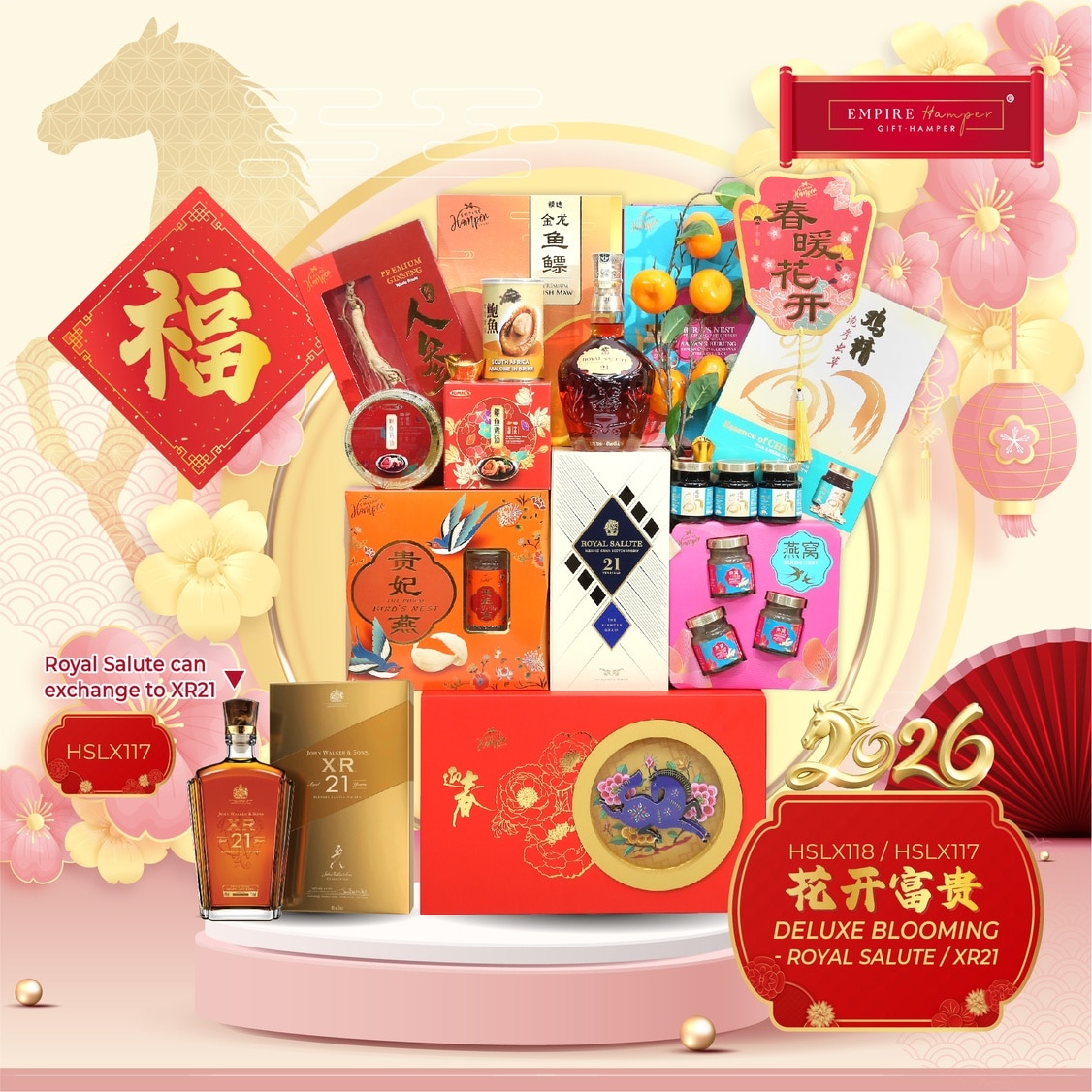Royal Salute '21 Years Old - Blended Grain' Scotch Whisky 70cl Wild Ginseng Gift Box 1box South Africa Abalone in Brine 425g Abalone Chicken Soup with Scallop Graded Fish Maw 80g The Royal Bird Nest 3x150ml Bird Nest with Ginseng & Rock Sugar 3x70ml Chicken Essence with Ginseng & Cordyceps 3x70ml Canadian Ginseng Tea 30g Precious Red Date Jujube 200g Exquisite 3D Design Basket , Packing & Decoration New Year Greetings Card