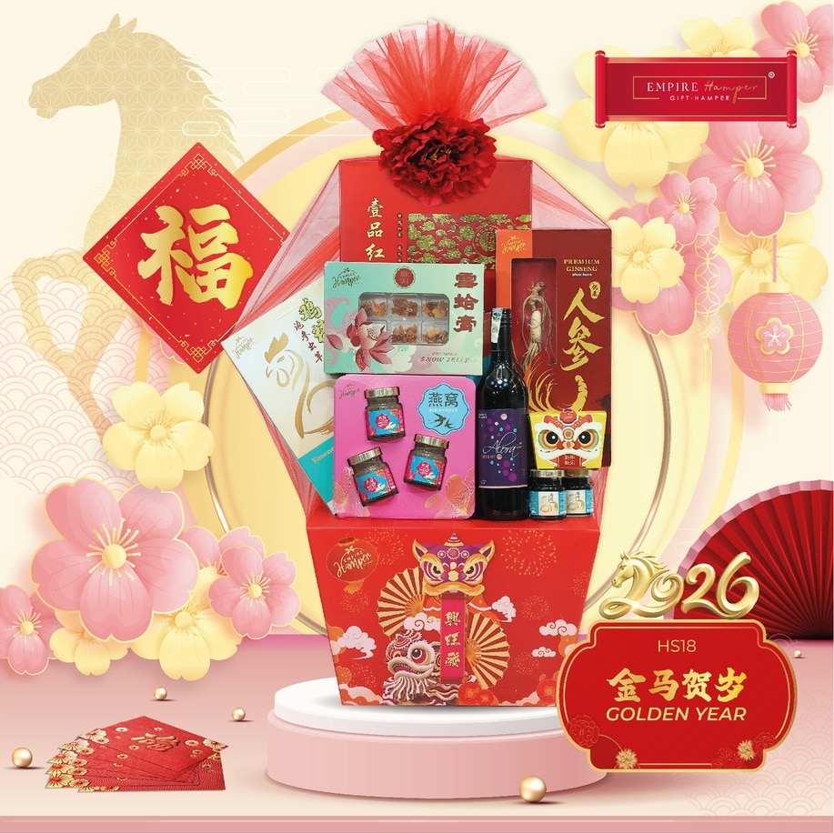 Premium Red Wine 750ml Wild Ginseng Gift Box 1box Bird Nest with Ginseng & Rock Sugar 3x70ml Chicken Essence with Ginseng & Cordyceps 3x70ml Hashima Snow Jelly 15g Precious Red Date Jujube 200g Selection New Year Cookies 1 box Exquisite Packing & Decoration New Year Greetings Card