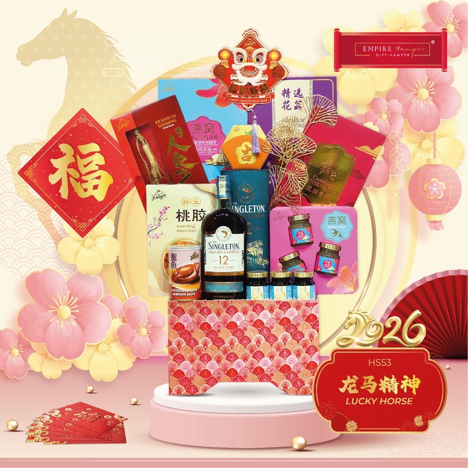 The Singleton of Glen Ord 12 Year Old 70cl Wild Ginseng Gift Box 1box Premium Mushroom 100g Australia Abalone in Brown Sauce 425g Bird Nest with Ginseng & Rock Sugar 3x70ml Chicken Essence with Ginseng & Cordyceps 3x70ml Canadian Ginseng Tea 30g Nourishing Peach Gum 100g Selection New Year Cookies 1 box Exquisite Wooden Embroidery Basket, Packing & Decoration New Year Greetings Card