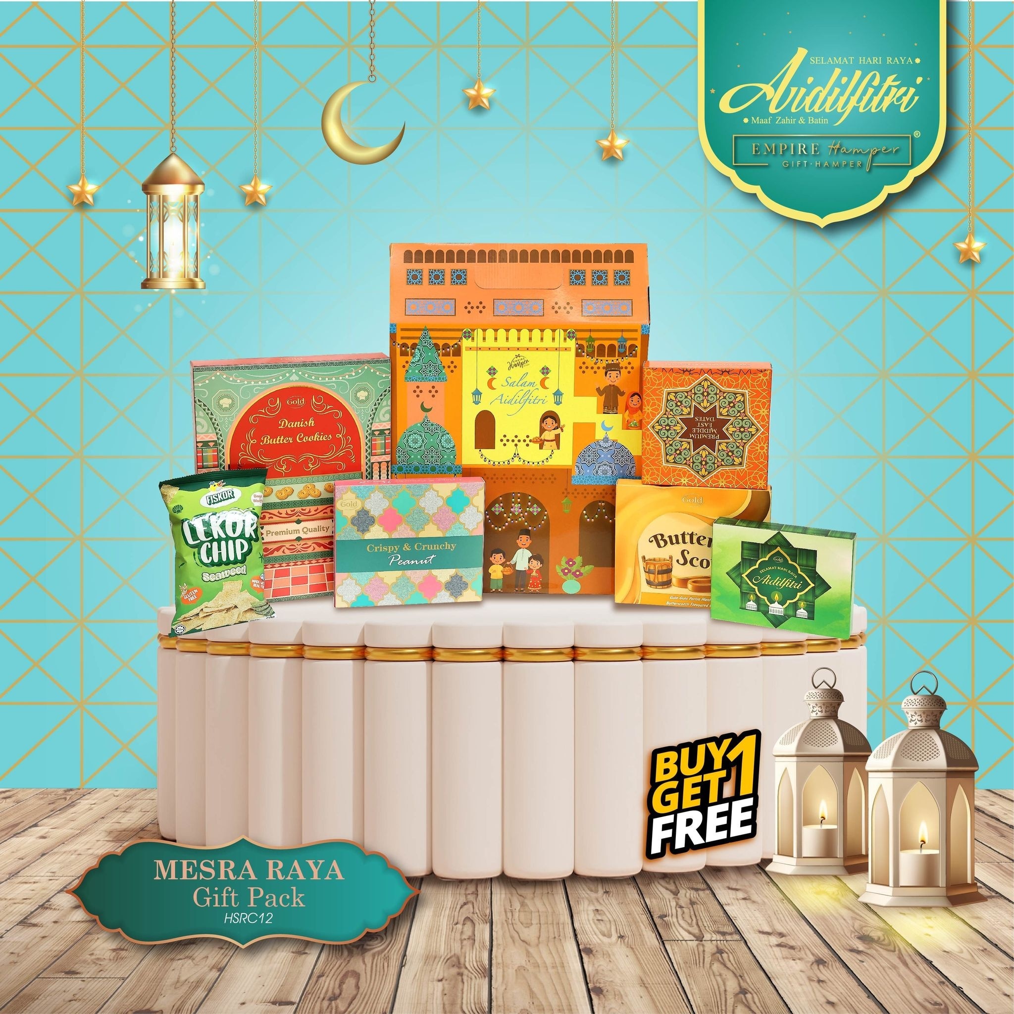 Premium Middle East Kurma 100g Premium Collection Danish Butter Cookies 120g Fiskor Lekor Chip 60g Victory Butterscotch Candy 150g Beyond Chewy Candy Mango 100g Crispy and Crunchy Peanut 70g Exquisite Gift Box Raya Greetings Card