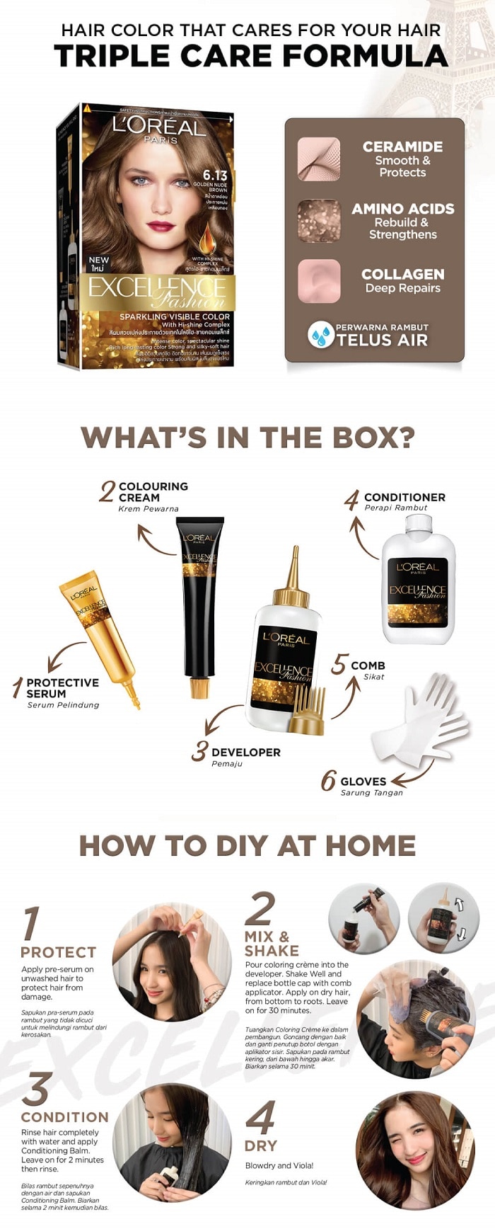 A TRIPLE CARE FORMULA / TRIPLE PROTECTION Enriched in ceramide and collagen, Excellence Fashion protects and strengthens hair. Hair is silky soft, feels stronger and replenished.