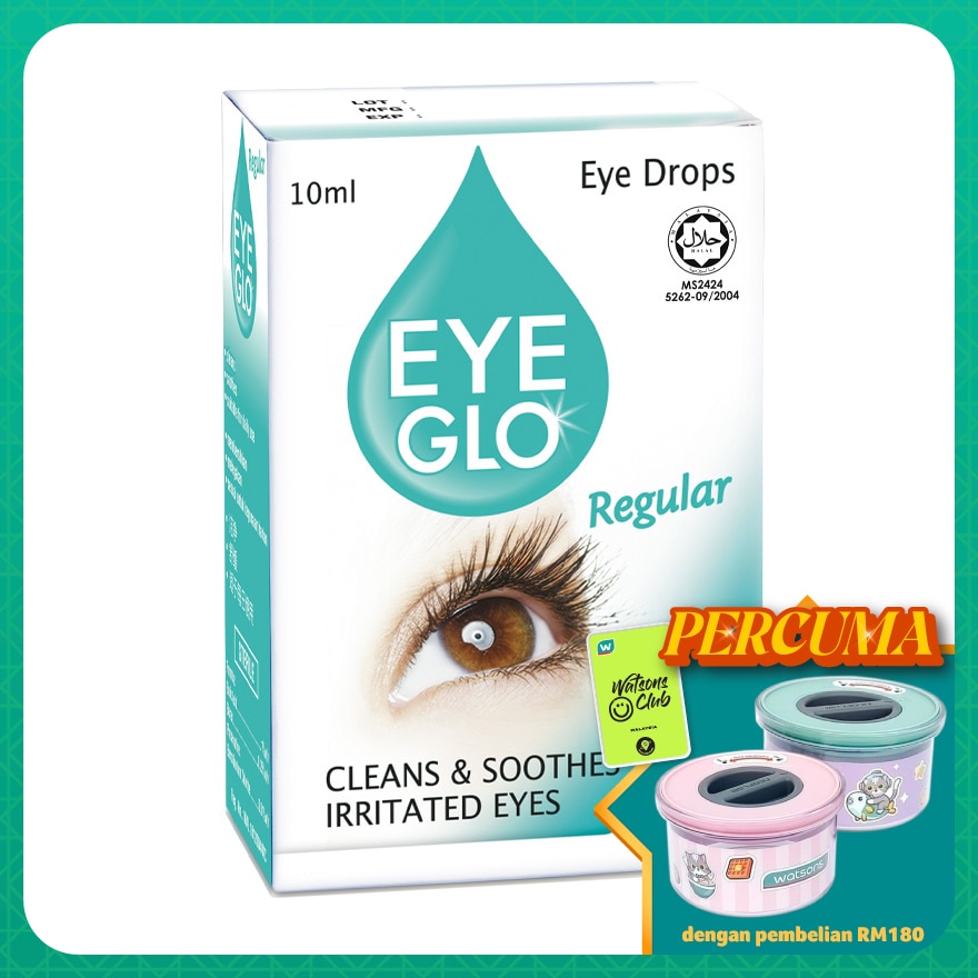 Eye Glo Regular contained Boric Acid 1%, Borax 0.25%, Benzalkonium Chloride 0.01%. Eye drop to relief dry eyes. Helps tp cleand and soothes the eyes. Suitable for daily use.