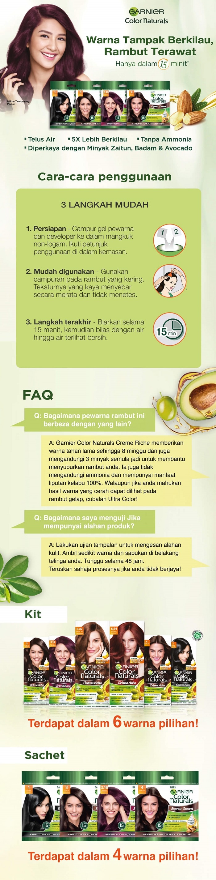 Garnier memberikan warna yang intens dengan COLOR LOCK TECHNOLOGY dan formulanya diperkaya dengan Olive, Avocado dan Almond Oil yang menjaga ketahanan warna dan rambut terawat selama 8 minggu.