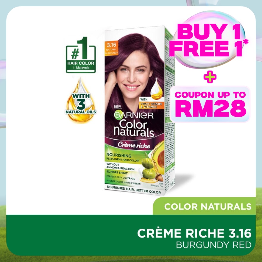 Garnier memberikan warna yang intens dengan COLOR LOCK TECHNOLOGY dan formulanya diperkaya dengan Olive, Avocado dan Almond Oil yang menjaga ketahanan warna dan rambut terawat selama 8 minggu.