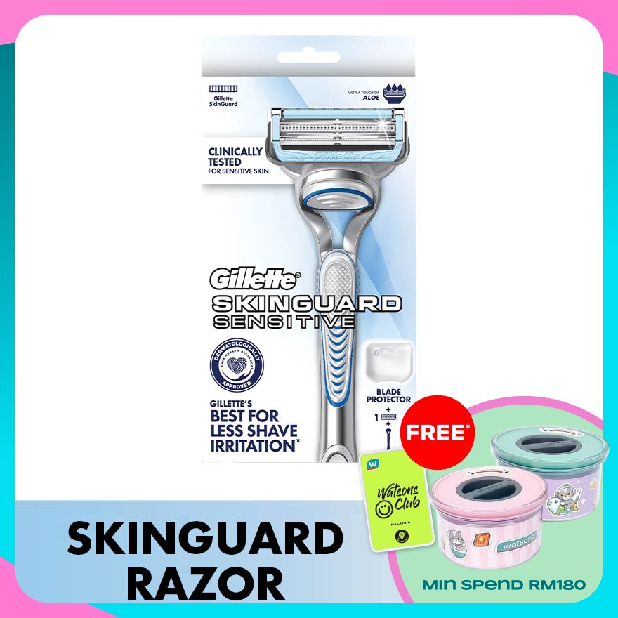 Gillette SkinGuard is our first razor specifically designed for men with sensitive skin and razor bumps. The razor shaves hair and protects the skin thanks to its unique SkinGuard positioned between the blades. It works to minimize tug and pull and cut hair at skin level, helping to prevent irritation. *CERTIFIED BY THE BRITISH SKIN FOUNDATION CLINICALLY PROVEN FOR SENSITIVE SKIN *OPTIMALLY SPACED GILLETTE BLADES TO REDUCE TUG & PULL *LUBRICATION BEFORE AND AFTER THE BLADES *PRECISION TRIMMER