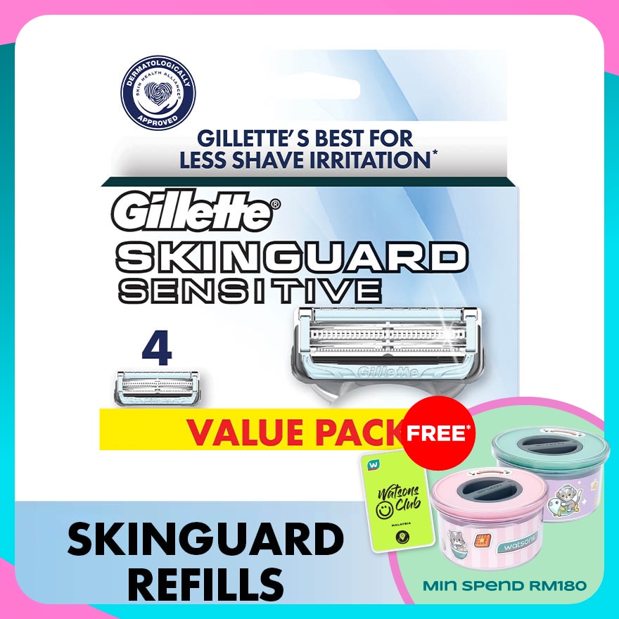 Gillette SkinGuard is our first razor specifically designed for men with sensitive skin and razor bumps. The razor shaves hair and protects the skin thanks to its unique SkinGuard positioned between the blades. It works to minimize tug and pull and cut hair at skin level, helping to prevent irritation. *CERTIFIED BY THE BRITISH SKIN FOUNDATION CLINICALLY PROVEN FOR SENSITIVE SKIN *OPTIMALLY SPACED GILLETTE BLADES TO REDUCE TUG & PULL *LUBRICATION BEFORE AND AFTER THE BLADES *PRECISION TRIMMER