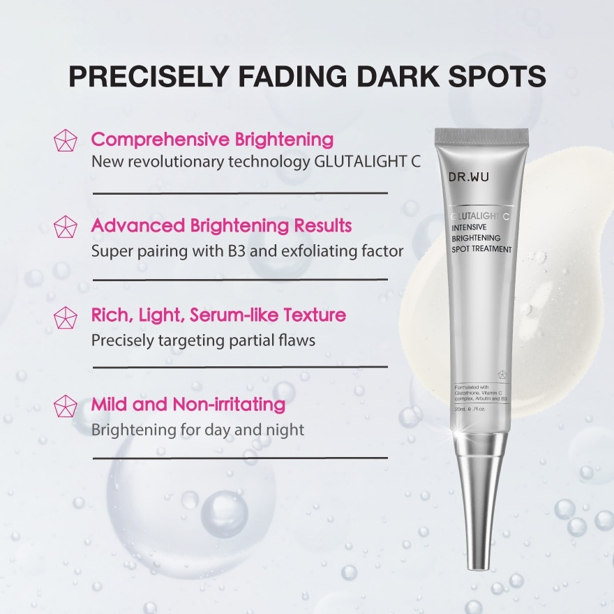 Glutalight C Intensive Brightening Spot Treatment is a targeted dark spot corrector, designed to visibly reduce dark spots, hyperpigmentation, and post-acne marks. The all-new Glutalight C formula combines a Vitamin C complex (Ethyl Ascorbic Acid, Aminopropyl Ascorbyl Phosphate, and Ascorbyl Palmitate), Glutathione, and multi-plant extracts, which can effectively lighten dull and uneven skin tone, inhibit melanin synthesis, and prevent hyperpigmentation. It also contains Niacinamide (B3) and Melaclear 2, which facilitate the skin renewal process while stabilizing the skin, leaving your skin looking spotless, youthful, clean, and clear.