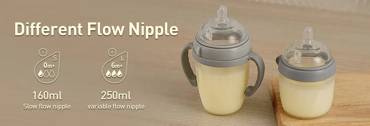 Please note: Our Silicone Baby Bottle comes in two sizes - 160ml and 250ml. A convenient handle is included with the 250ml model. A slow flow nipple is included with the 160ml bottle and a variable flow nipple is included with the 250ml bottle (both come with a clear PP cap to keep your teat covered between uses).