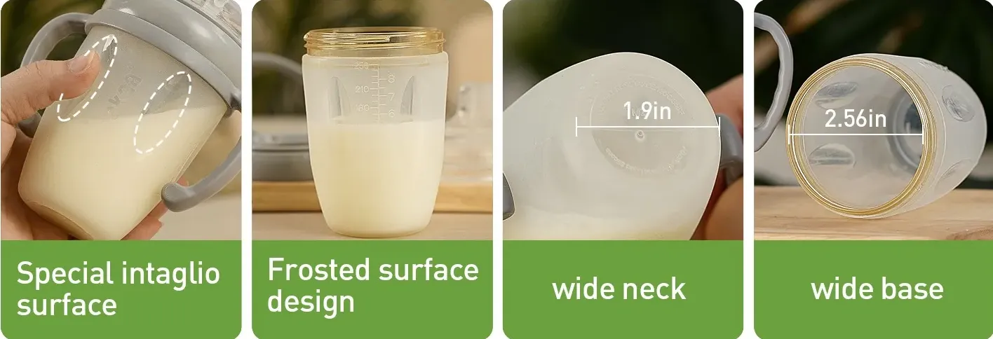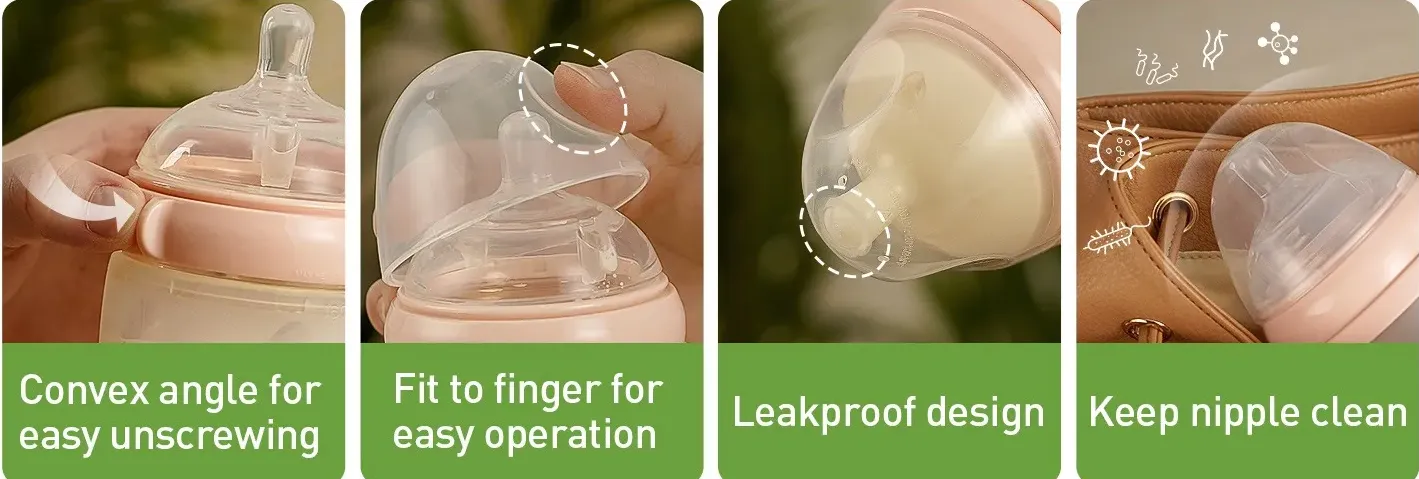 This baby bottle is made up of one silicone bottle base, one attachment ring, one slow or variable flow nipple, one clear PP cap and one handle (250ml model only.)