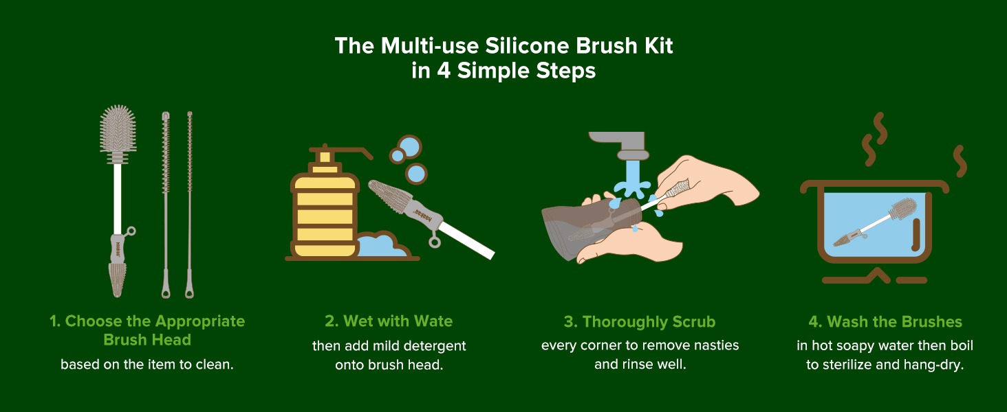 Our Double-Ended Silicone Brush features soft and flexible silicone bristles that provide a 360 clean for all your items. On one end, there's a brush head that's perfectly-sized for scrubbing your pumps, bottles and milk storage bags, and on the other, there's a brush with a tapered tip to reach the corners of your bottle teats, milk collectors and more! This kit also comes with two different sized Silicone Tube Brushes, with soft silicone edges that help you clean the inside of narrow openings - such as reusable straws, colostrum collectors and dummies.